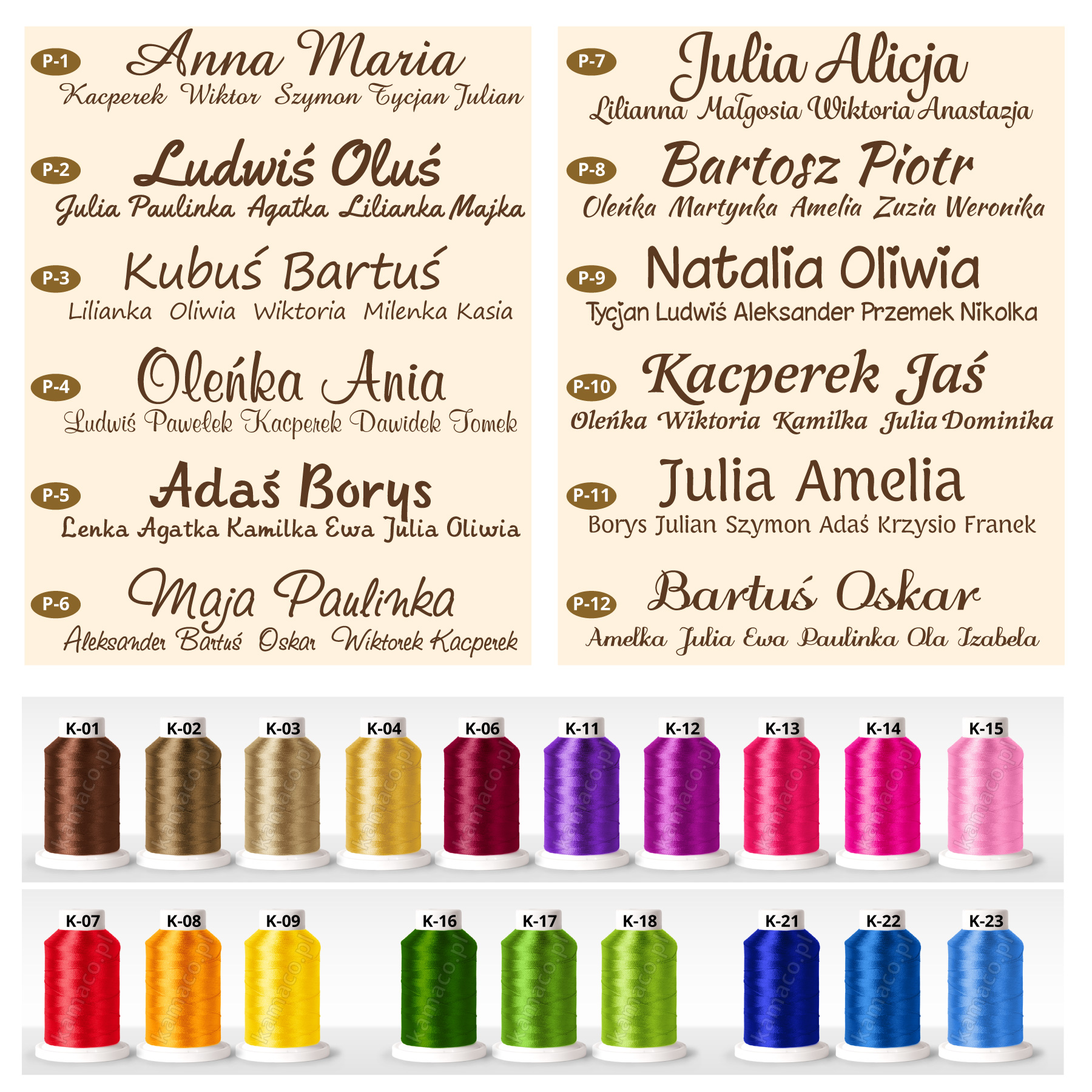 На подушці ми розміщуємо: Напис, вишитий великими літерами, макс. 14 символів. Гарнітура та колір написів такі ж, як на ковдрі. Напис, розміщений по діагоналі в кутку подушки, разом з малюнком, що збігається з малюнком ковдри.