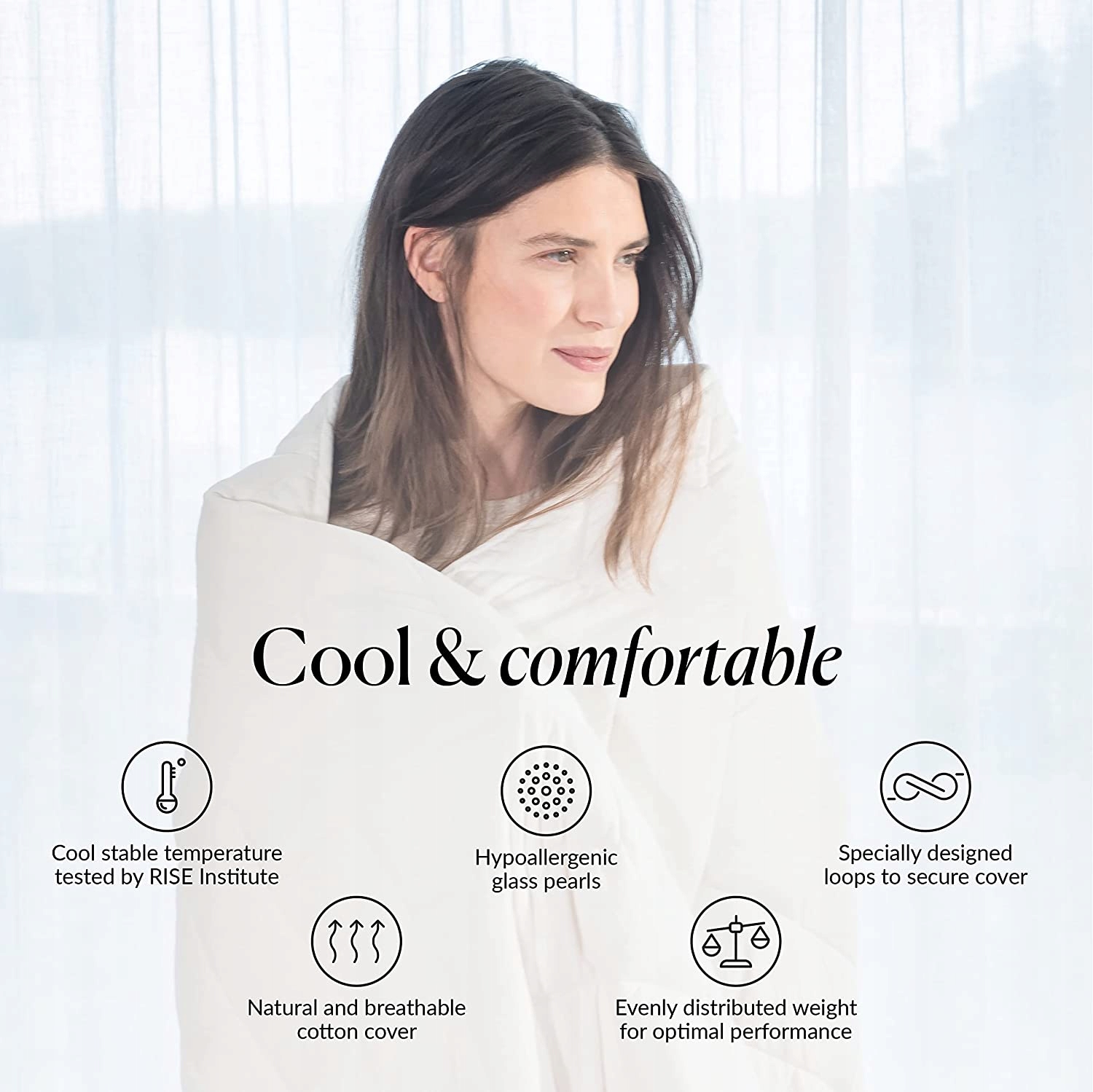 - Регулювання температури: вологовідвідний наповнювач і гіпоалергенний бавовняний зовнішній шар запобігають потовиділенню вночі та підтримують приємну низьку температуру (сертифіковано Інститутом RISE). Крихітні скляні намистини, рівномірно вшиті всередину обтяженої ковдри, роблять ковдру важкою.
