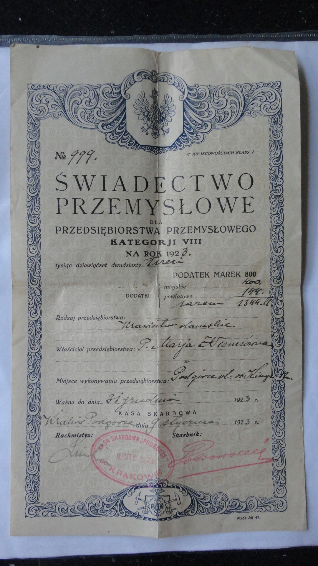 KRAKOW PODGORZE ULICA KINGI SWIADECTWO PRZEMYSLOWE 1923 ROK