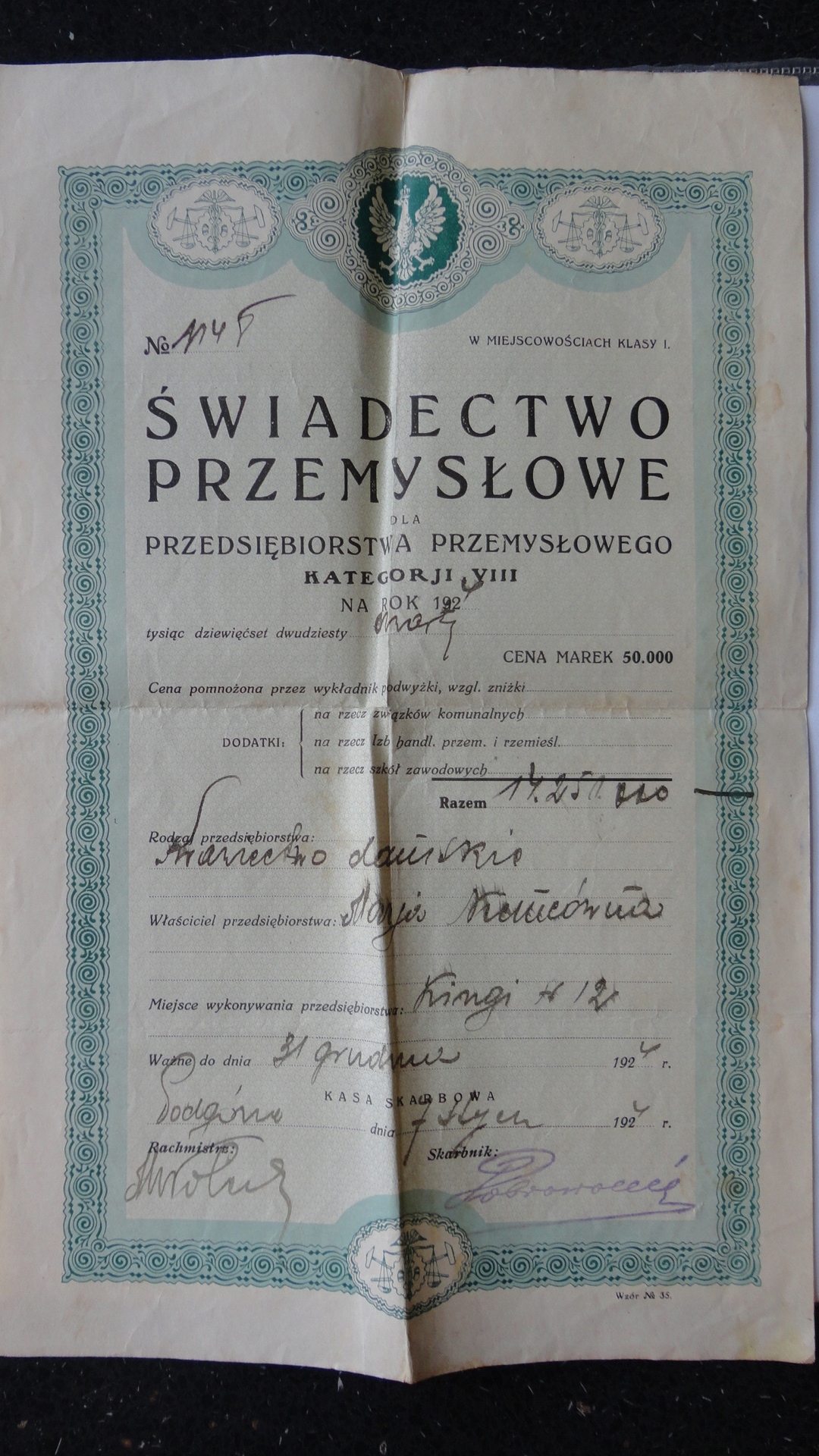 KRAKOW PODGORZE ULICA KINGI SWIADECTWO PRZEMYSLOWE 1924 ROK