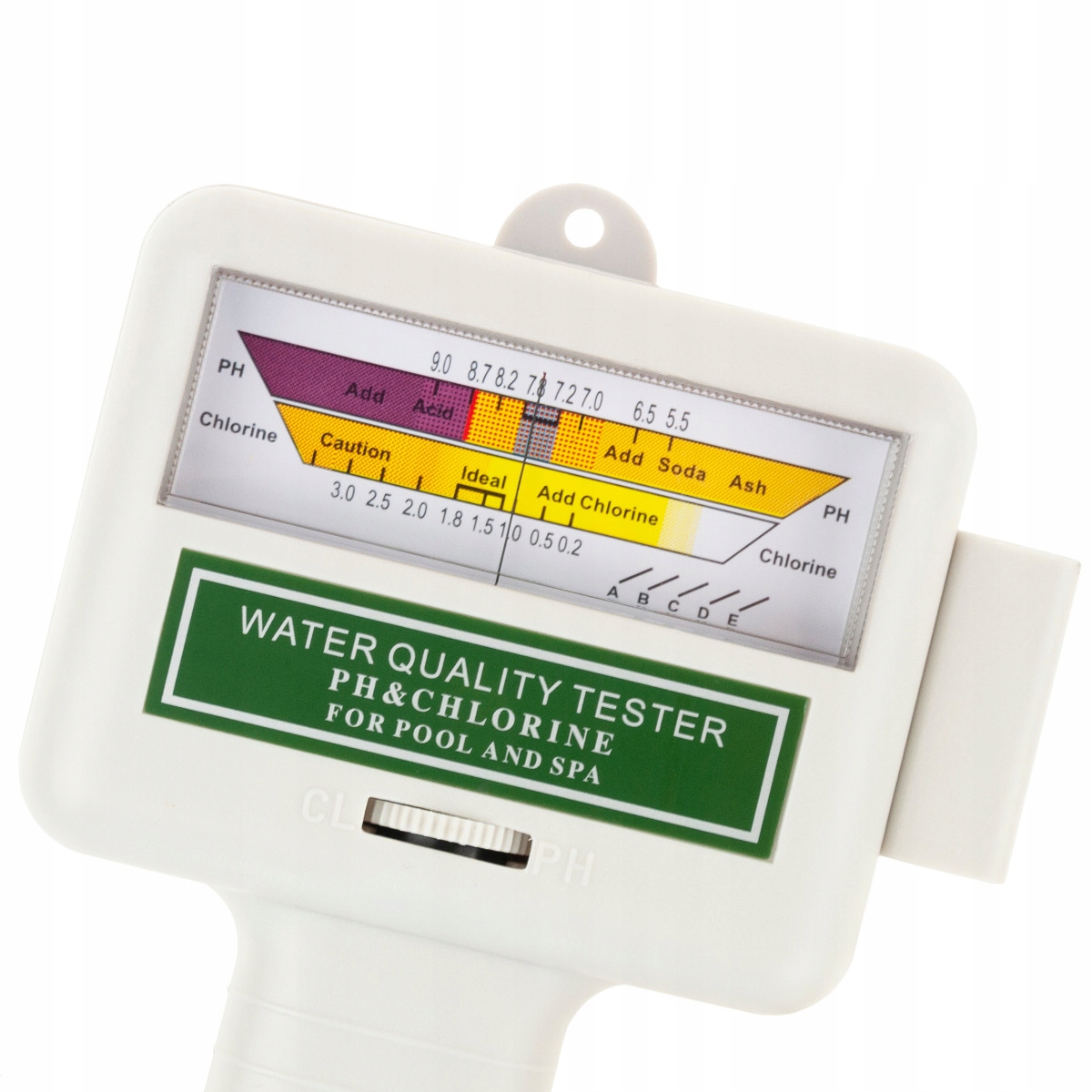 5. Коли зонд все ще знаходиться у воді, поверніть колесо на поверхні тестера до упору вліво в напрямку «CL». Повільно повертайте коліщатко праворуч, доки стрілка не збігається з рівнем хлору, зафіксованим звичайним рідинним тестером (наприклад, 1,5 ppm)