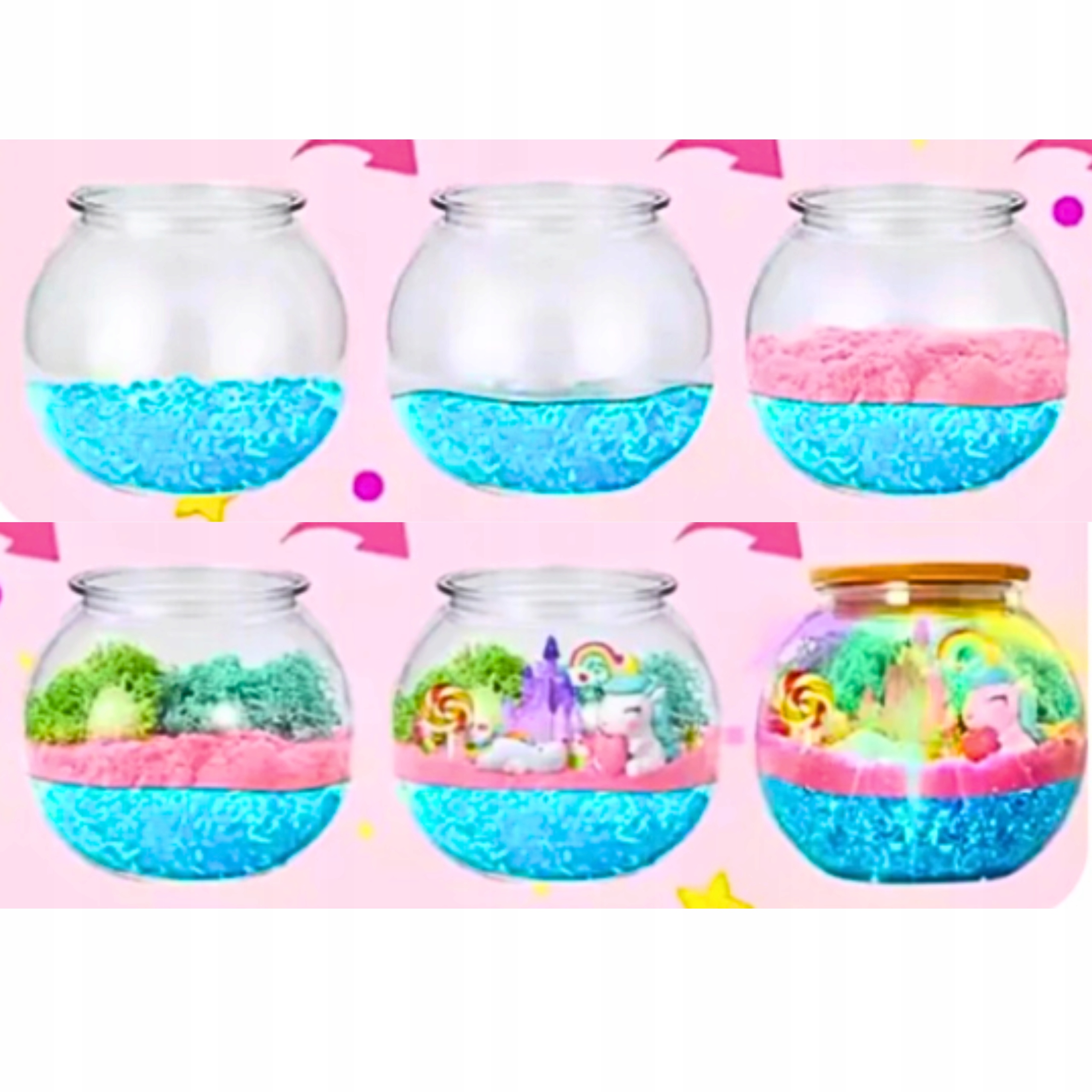 - Ефектний вигляд - різнокольорові кристали, пісок, веселка та фігури створюють чарівну композицію.
