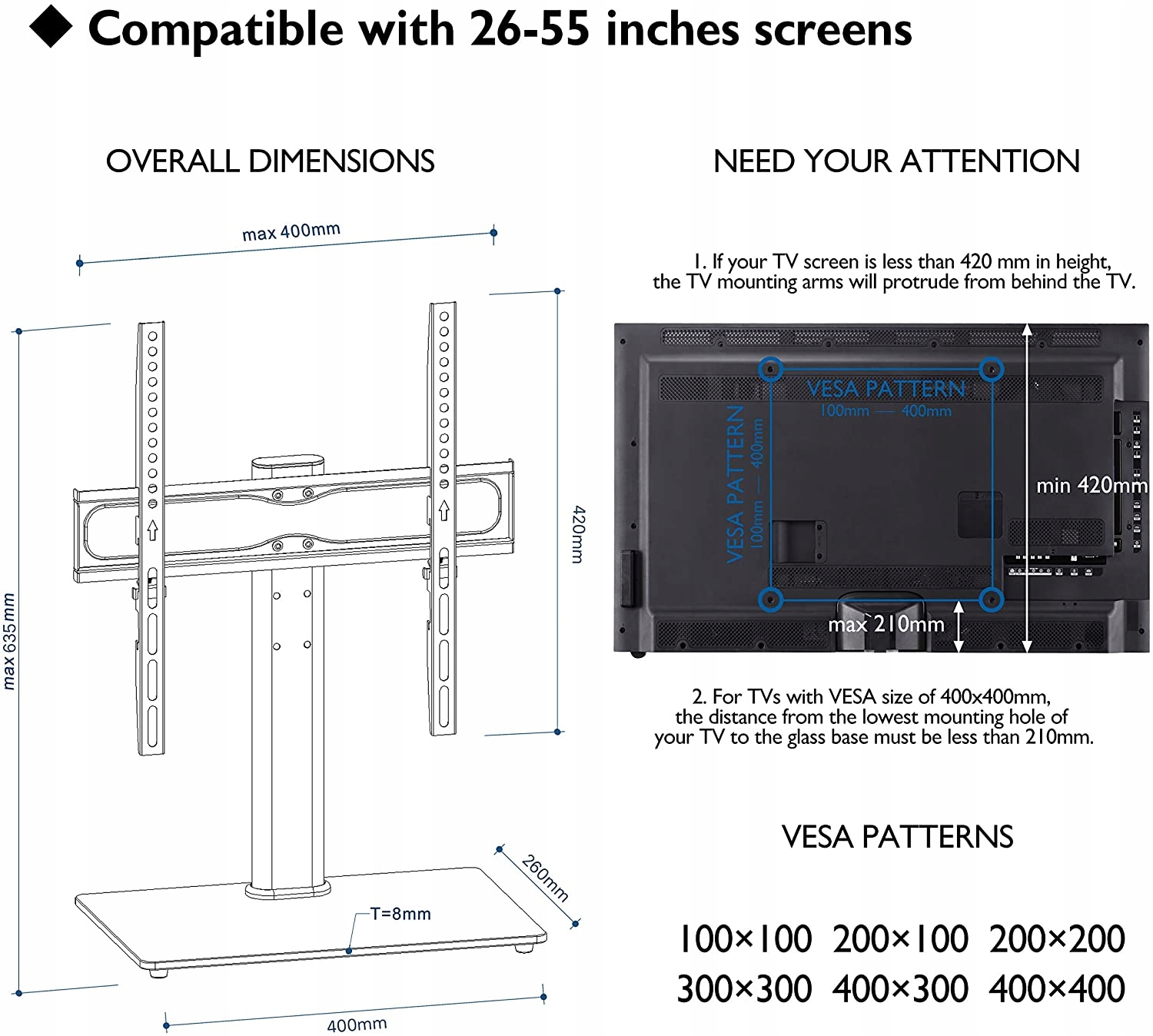 Універсальна підставка підходить для більшості 26 32 37 40 42 47 50 55 дюймів телевізори; Шаблони VESA: 100x100/200x100/200x200/300x200/300x300/400x200/400x300/400x400, є сумісний із телевізорами таких брендів, як Samsung, LG Electronics Sony Sharp Panasonic Philips JVC Hitachi Hisense Toshiba LCD LED OLED QLED Плазма.