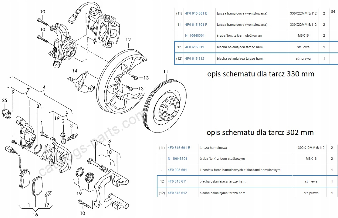 ВИРОБНИК НАДАЄ ЛИШЕ 302 мм, але ми перевірили за номером. оригінал для А6 С6 і виявилося, що вони також підходять для дисків 330 мм - схема додається