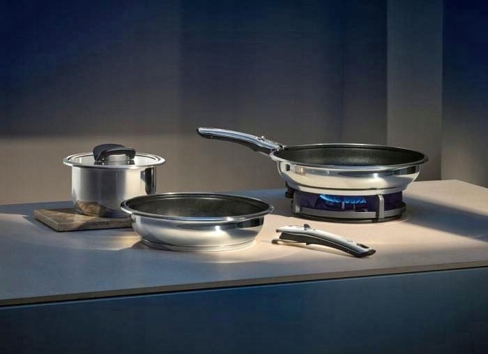 Серія Click & Serve WMF базується на окремих корпусах посудин і знімній ручці. Завдяки такій структурі продукти займають на до 50% менше місця в шафах, ніж звичайні каструлі та/або сковорідки.