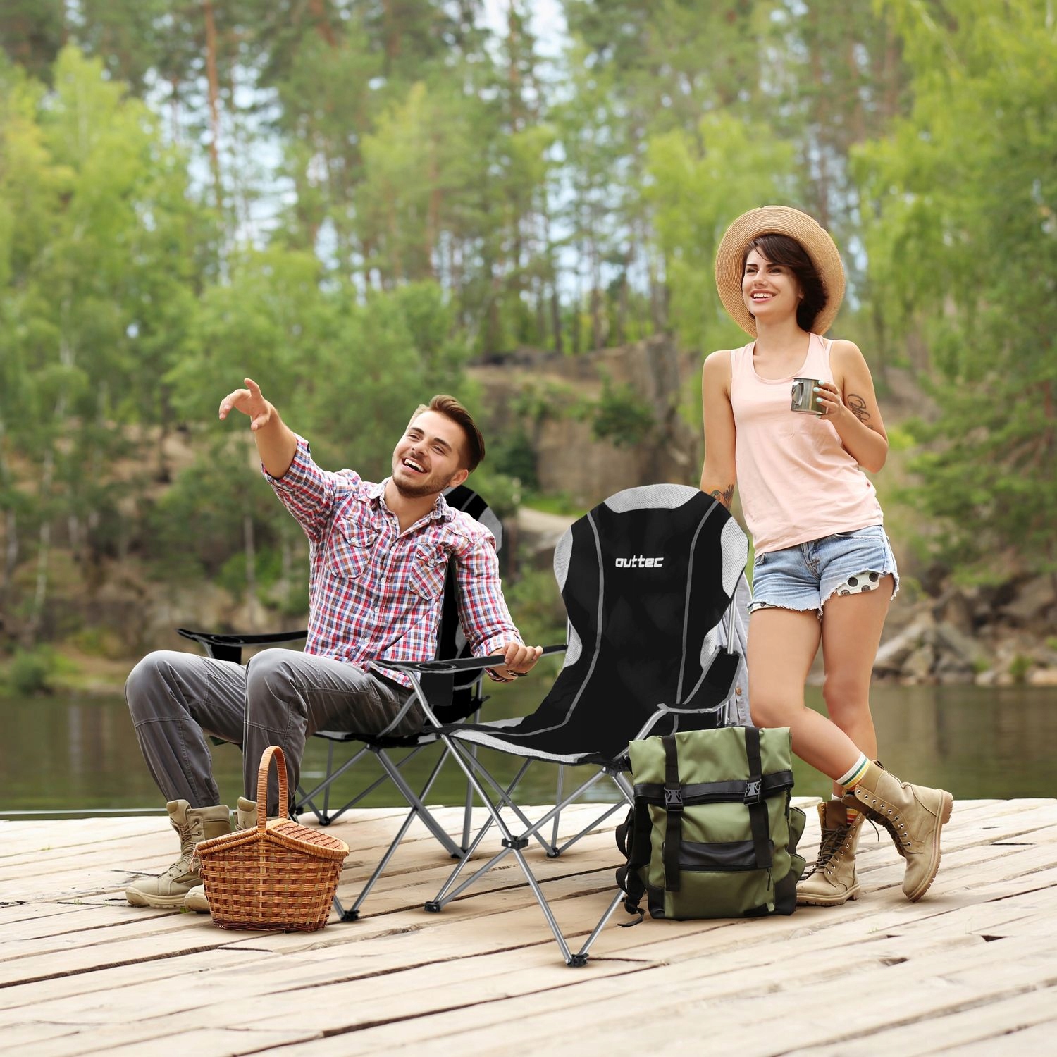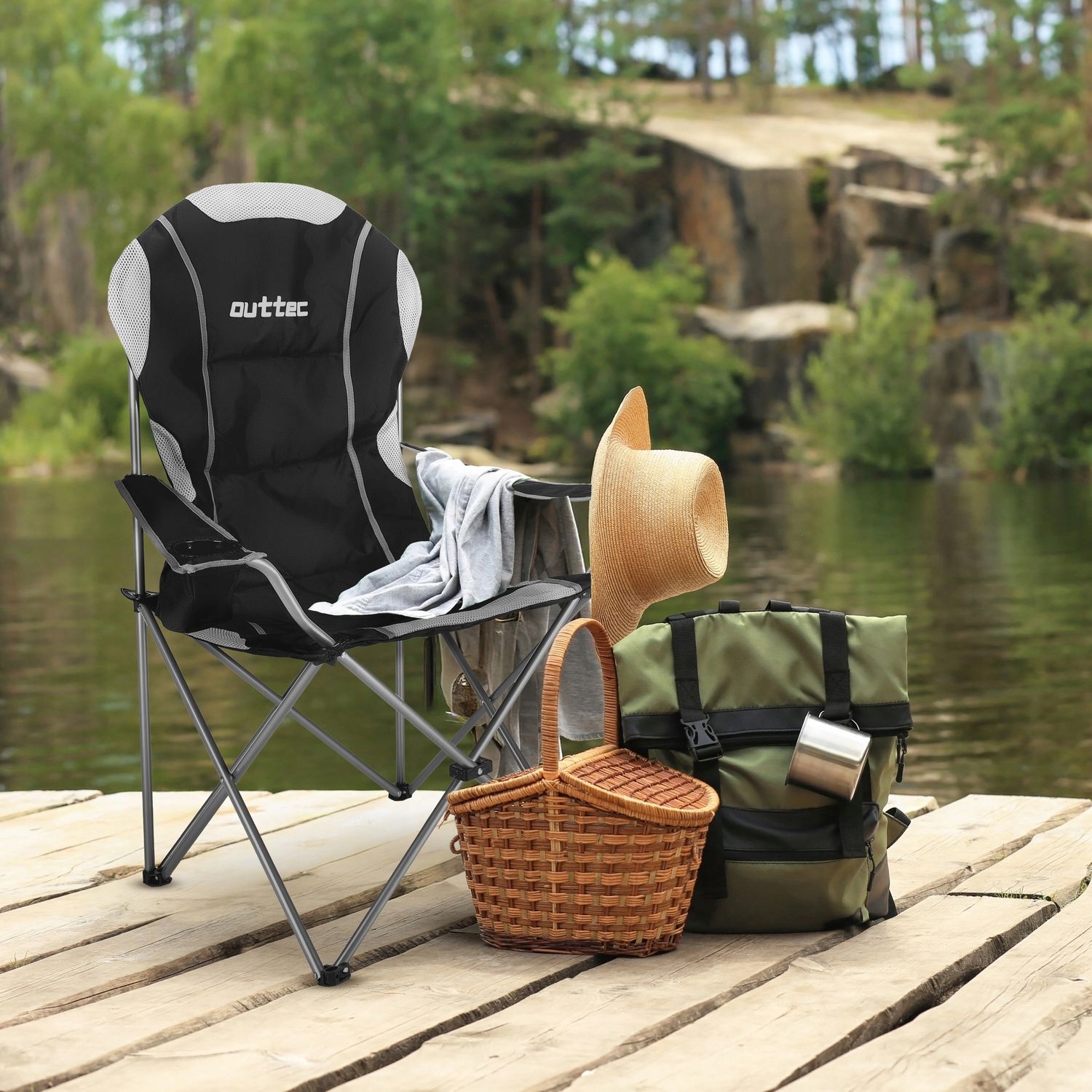 Складний стілець Outtec - ідеальне рішення для кемпінгу, риболовлі або відпочинку. твердий сталевий каркас гарантує стабільність, а міцний матеріал сидіння стійкий до пошкодження та бруду. вставки сітки вдосконалюють вентиляцію та зручні підлокітники з простором для напою збільшують комфорт використання. Складний дизайн та кришка з регульованим ремінцем роблять стілець легким у транспорті та зберіганні.