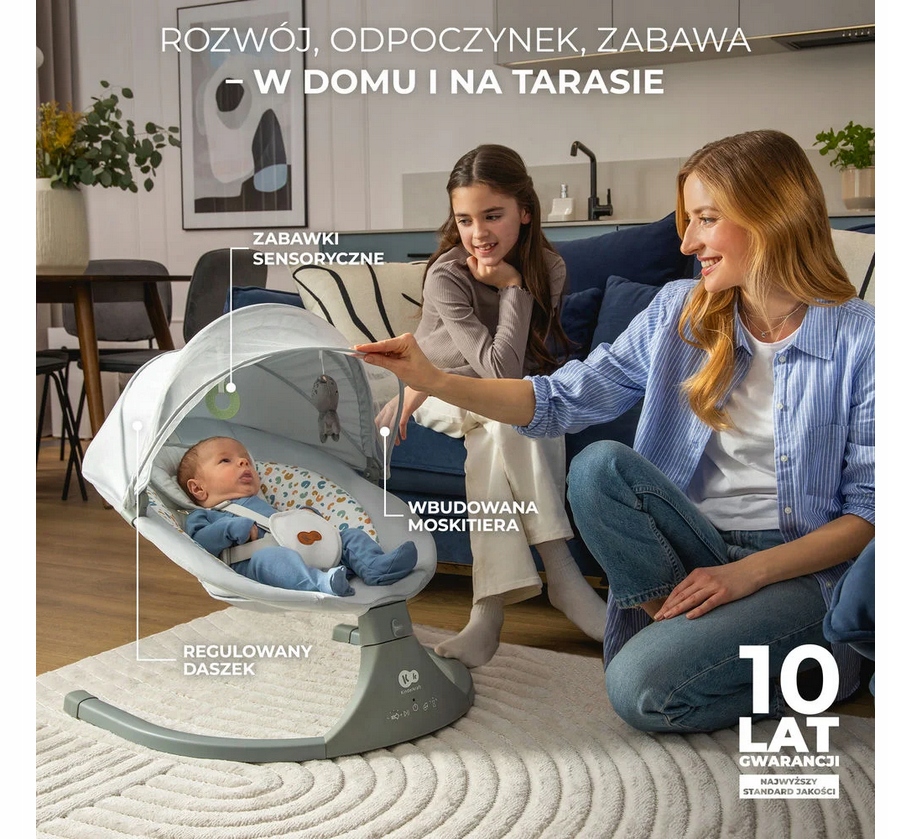 LUMI 2 постачається з пов’язкою на голову з двома іграшками, які зацікавлять вашого малюка та заохочуватимуть його витягувати ручки та практикувати хват. Там малюк зможе не тільки відпочити, а й активно провести час, розвиваючи свої навички. Ви також можете використовувати качалку на вулиці: в балдахіні є москітна сітка, яка захистить малюка від комах, якщо ви вирішите насолодитися гарною погодою на терасі чи балконі.