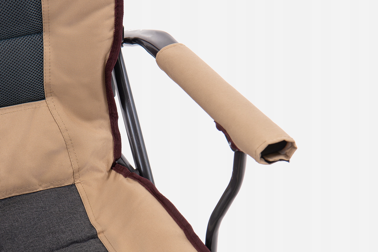 Складне туристичне крісло – ідеальний вибір для людей, які цінують комфорт під час відпочинку на природі. Це ідеальний вибір для тераси вдома, кемпінгу, відпочинку, у парку або для барбекю. Крісло характеризується м'якою, стьобаною, зручною оббивкою. Завдяки спеціальній системі мікровентиляції спинки крісло забезпечує достатню вентиляцію, що запобігає потінню спини. Крісло має рухливу спинку, яка регулюється відповідно до позиції, яку хоче прийняти користувач. Виріб також оснащений зручними підлокітниками з практичним тримачем для чашки або пляшки.