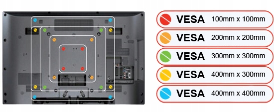 - Стандарт VESA: 200 x 200 мм, 300 x 300 мм, 400 x 200 мм, 400 x 400 мм, 600 x 400 мм