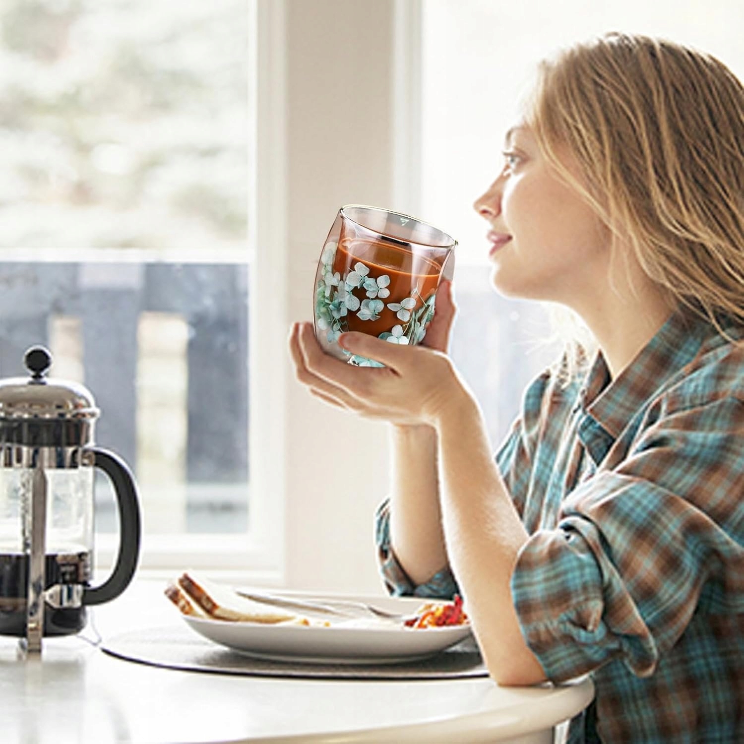 Про цей продукт Стильний квітковий дизайн: Елегантний квітковий візерунок на цій подвійній скляній чашці покращує будь-який стіл, роблячи її привабливим вибором для подачі еспресо, капучіно та латте, ідеально підходить для щоденного використання та особливих випадків. Інноваційна теплоізоляція: розроблена з двошаровою конструкцією, чашка ефективно ізолює ваші напої, зберігаючи їх гарячими, зберігаючи прохолодними на дотик, запобігаючи випадковому спалюванню під час тримання. Велика місткість: ця універсальна скляна чашка об’ємом 350 мл підходить для різних типів напоїв, зокрема кави, чаю, гарячого шоколаду тощо, що робить її доповненням до вашої кухні чи кав’ярні. Високоякісне боросилікатне скло: виготовлена з боросилікатного скла найвищої якості, ця чашка є термостійкою, що дозволяє вам насолоджуватися гарячим напоєм без перерви чи термічного удару, забезпечуючи довговічність і щоденне використання Легко Догляд і обслуговування: цю стильну кухоль, яку можна мити, можна легко мити, що робить її зручною для зайнятого способу життя, а завдяки її елегантному дизайну вона чудово доповнює декор вашої кухні чи обіднього столу.