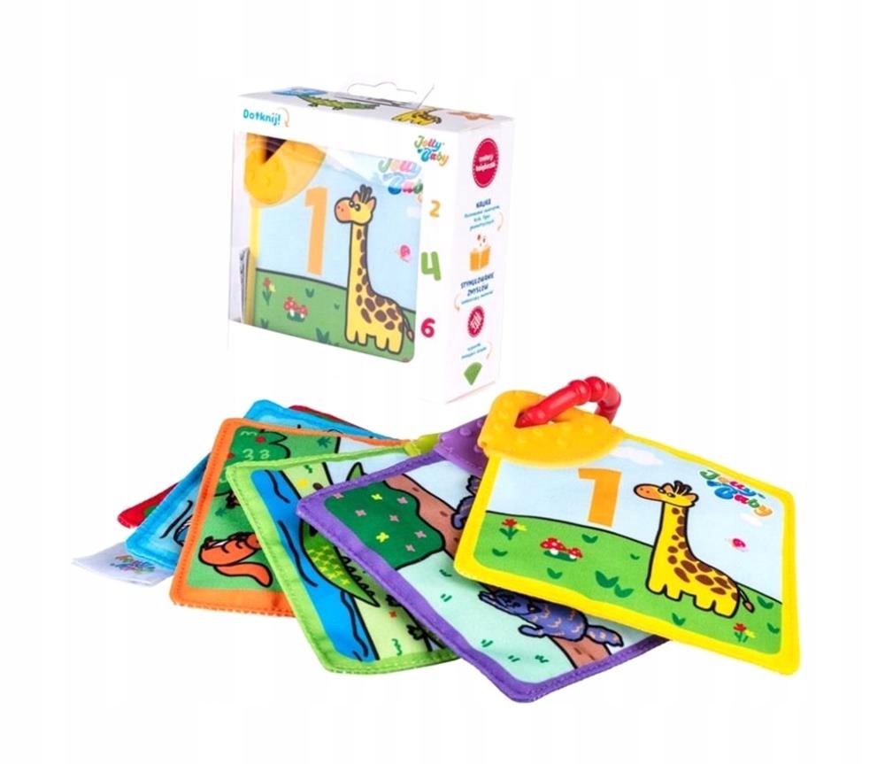 Відкривайте тварин і дізнавайтеся про числа за допомогою книги, повної барвистих малюнків! Він складається з шести двосторонніх тканинних карток, кожна з яких має практичний прорізувач для зубів у кутку, який полегшить прорізування зубів. Елементи, що шелестять, і приємні малюнки захоплять малюка, стимулюючи його почуття та позитивно впливаючи на його розвиток. Окремі сторінки з’єднані між собою кільцем, яке можна прикріпити у вибраному місці.