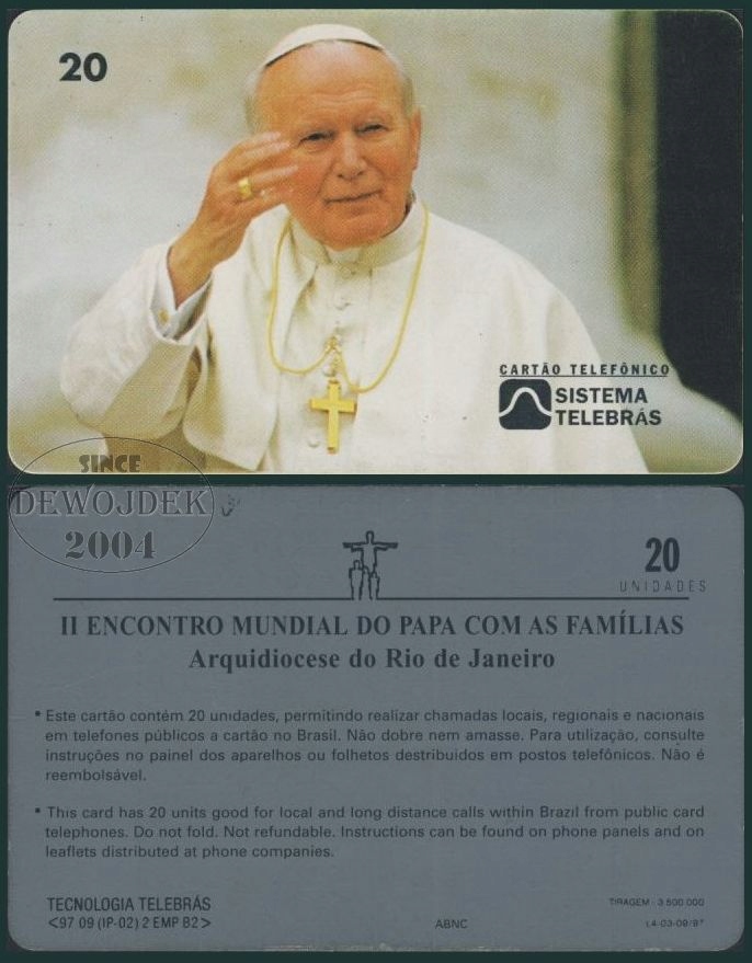 KTS - BRAZYLIA # Papież Jan Paweł 2 # 1997 typ 2 # 03-09/97 # karta zużyta