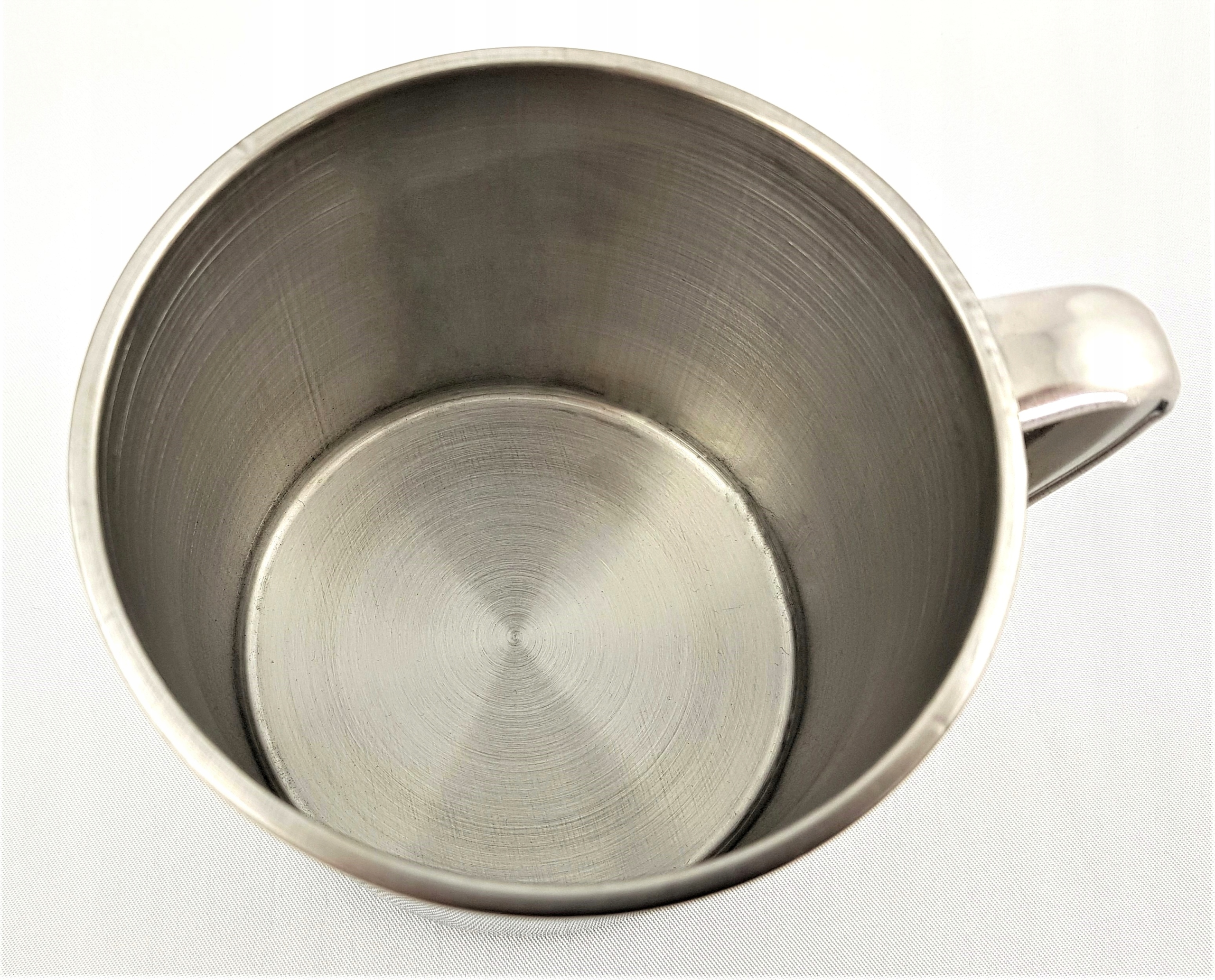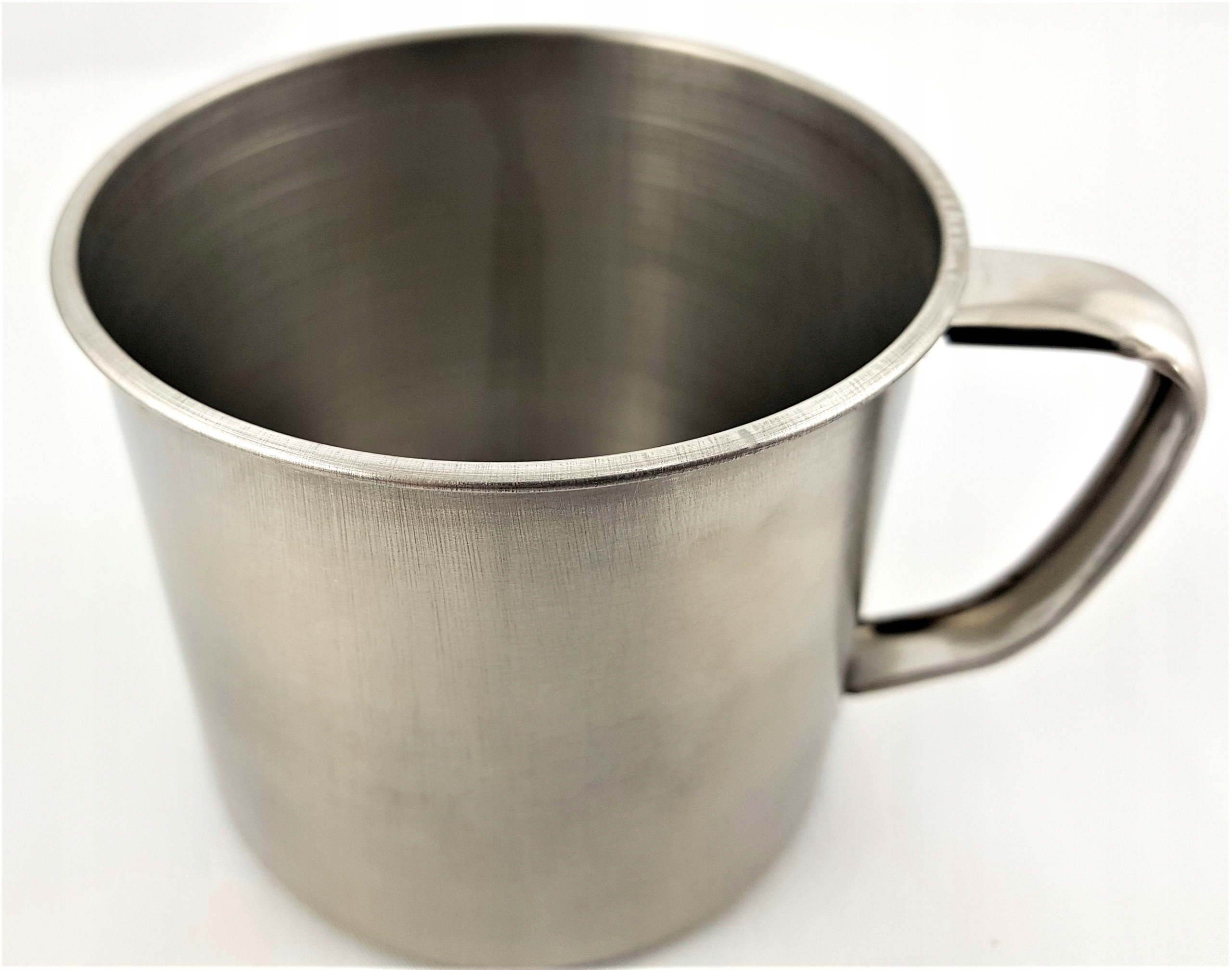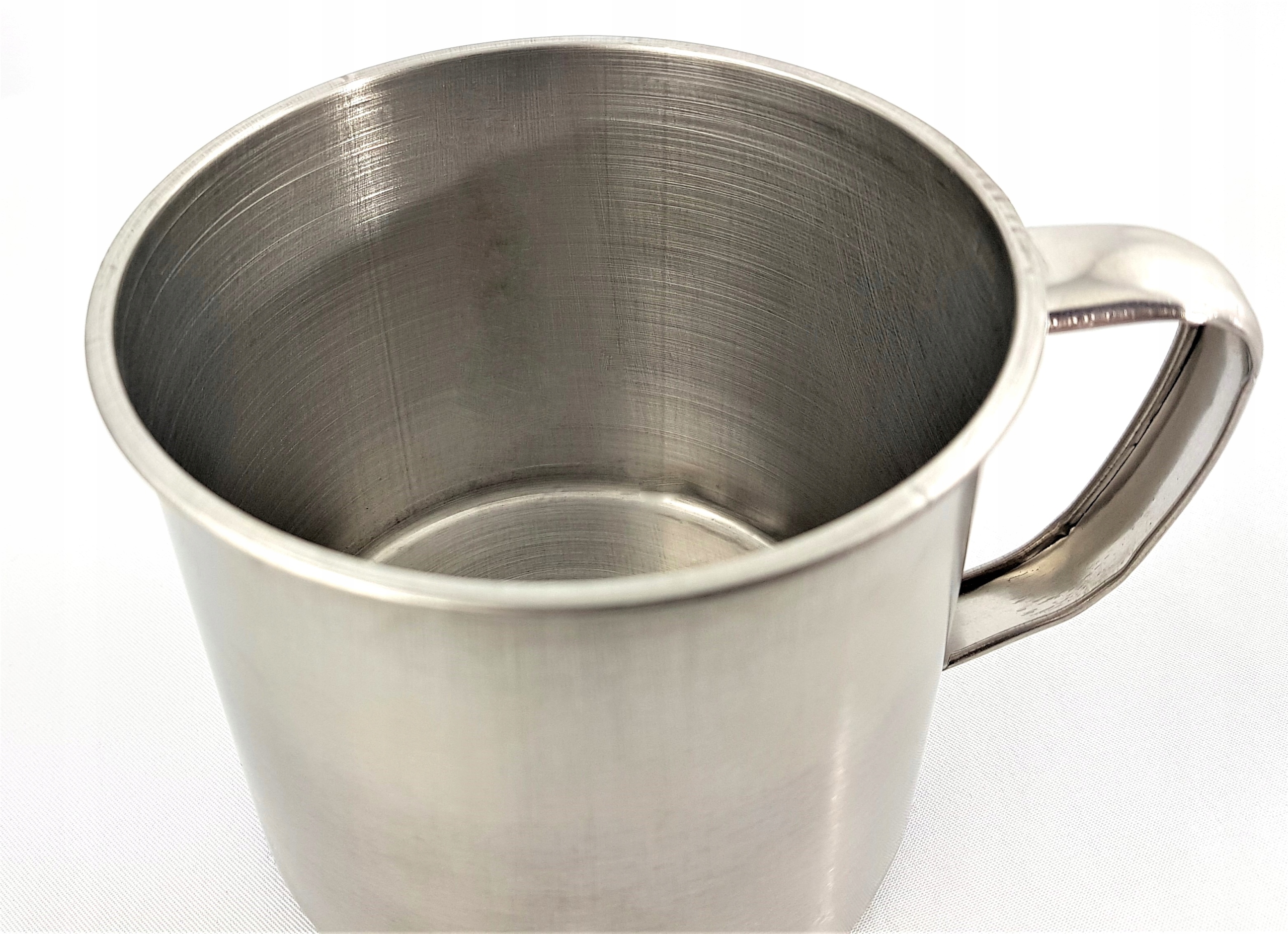 кухоль з нержавіючої сталі з вухом потужністю 300 мл. Чашки супер -блакиті, вони просто не зважують нічого, що є надзвичайно важливим, коли вам доведеться їх носити. Чашки підходять для надягання печі та кипіння води.