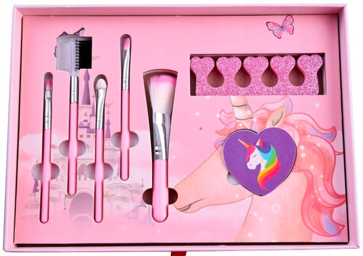 У футлярі все необхідне для створення гарного макіяжу та аксесуарів для укладання. Кожен елемент був ретельно відібраний, щоб забезпечити години творчої гри та розвитку уяви. Рожева гарно декорована коробка з мотивом єдинорогів, квітів і метеликів містить макіяж, аксесуари та набір бісеру для створення прикрас.
