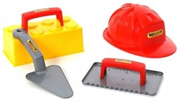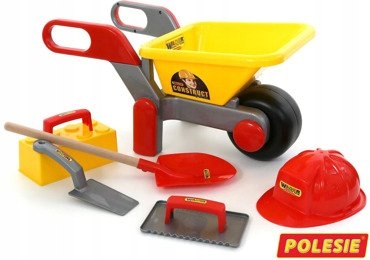 Набір містить все необхідне для творчої діяльності, що розвиває уяву та координацію рухів. Маленькі каменярі знайдуть тут велику міцну тачку, захисну каску, кельму, кельму мулярську та велику форму з ручкою – цеглинку, а ще є лопата з дерев’яним держаком. Тачка оснащена великим колесом і зручними ручками. Чого ще бажати?
