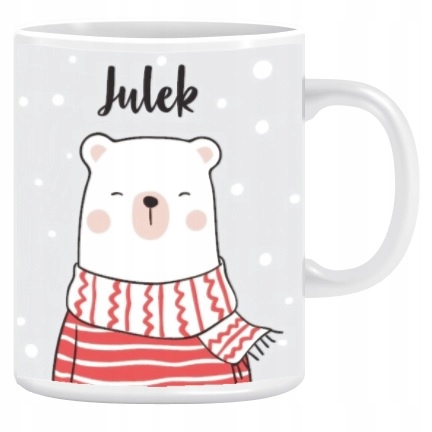 Кружка із зимовим плюшевим ведмедиком у різдвяному варіанті та з іменем дитини
