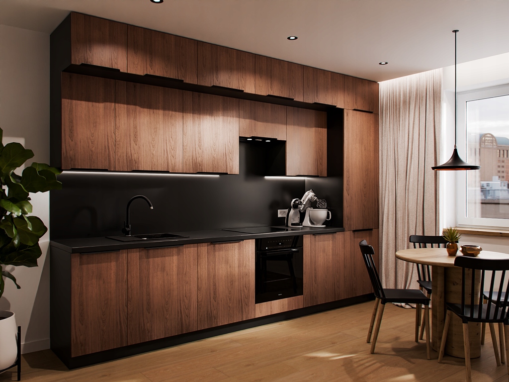 - колір і обробка фасадів нижніх шаф: кашемір, горіх окапі або чорний матовий (ламінат)