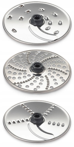 - з дисками для шинкування, нарізання та натирання (наприклад, картоплі) та зручною подачею інгредієнтів у кришці чаші та штовхачем, що дозволяє повністю натирати овочі та фрукти