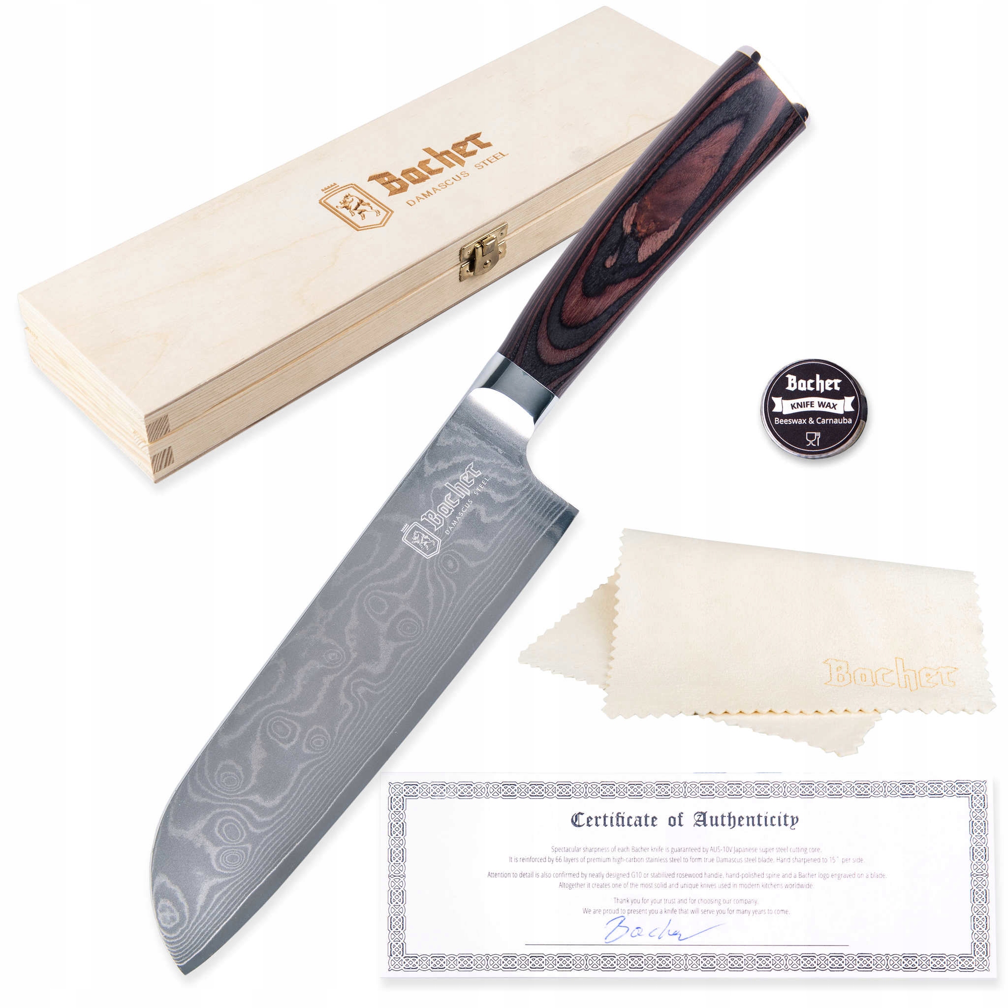 Bacher Santoku від японської Damascus Steel AUS -10V - подарунковий набір у дерев’яній коробці - коричневий