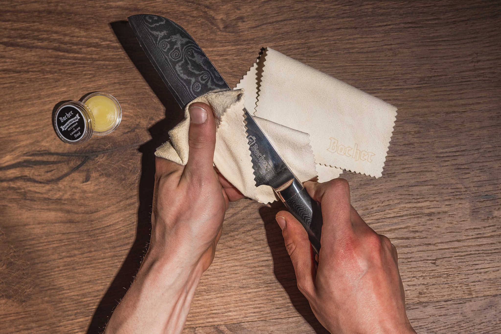 Як доглядати за ножем? Регулярно використовуйте ножовий віск, прикріплений до набору, який, завдяки спеціальній, безпечній формулі їжі: - захищає лезо, а також дерев’яні та синтетичні ручки,