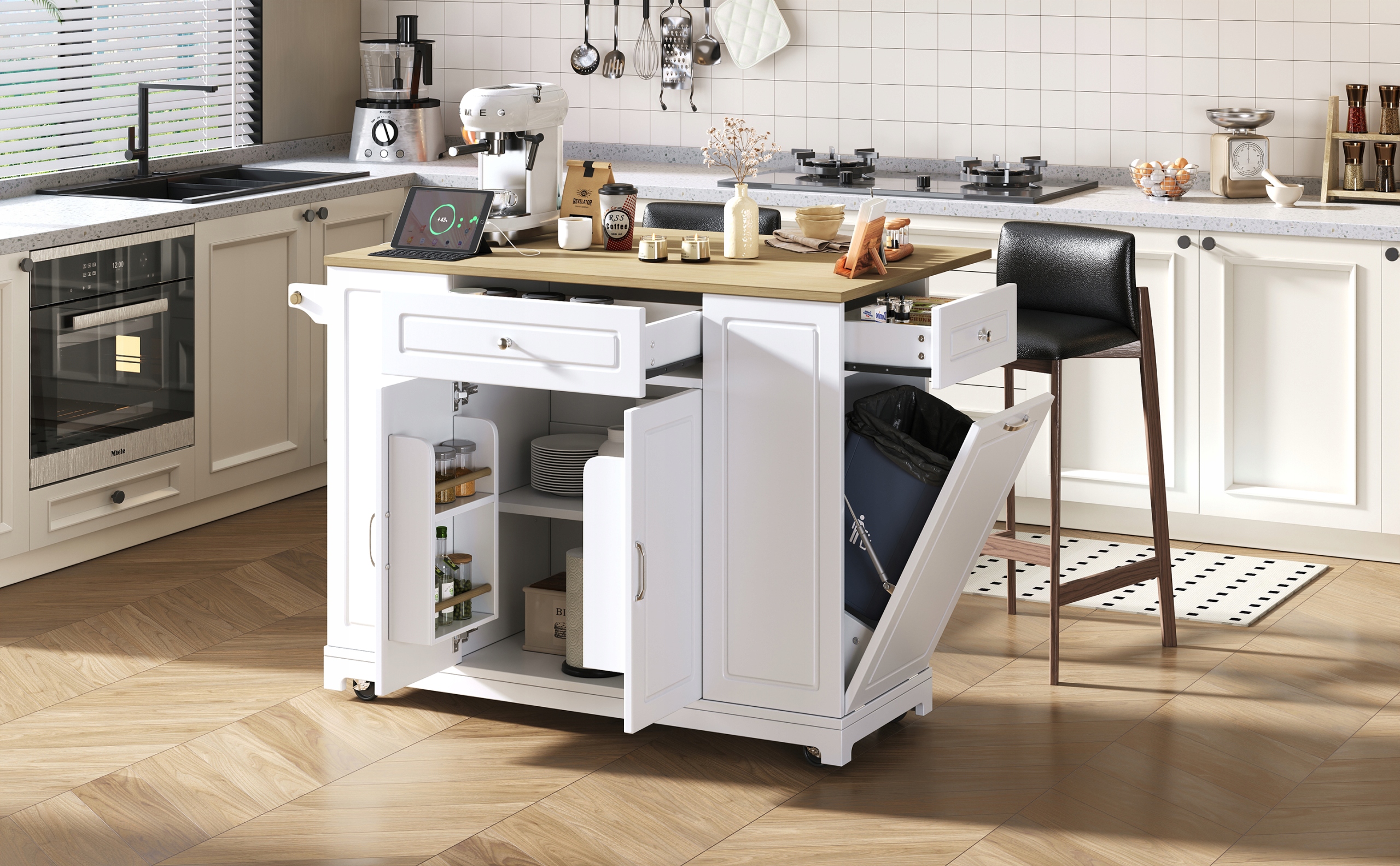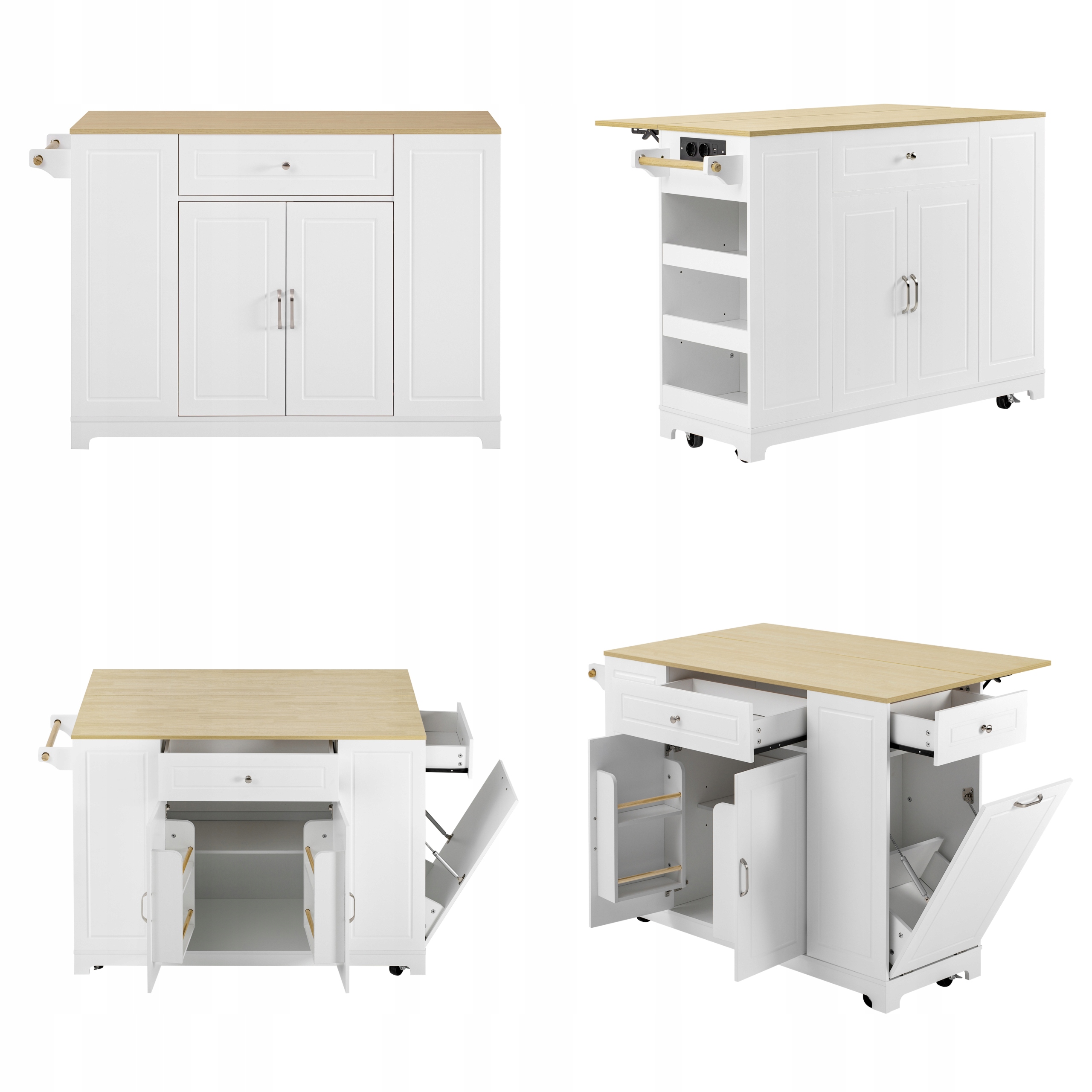 Кухонний острів на колесах, складна обідня зона, кухонний острів з багатофункціональними ящиками та контейнером для сміття, мобільний кухонний острів, ідеальний для кухні та їдальні (білий)