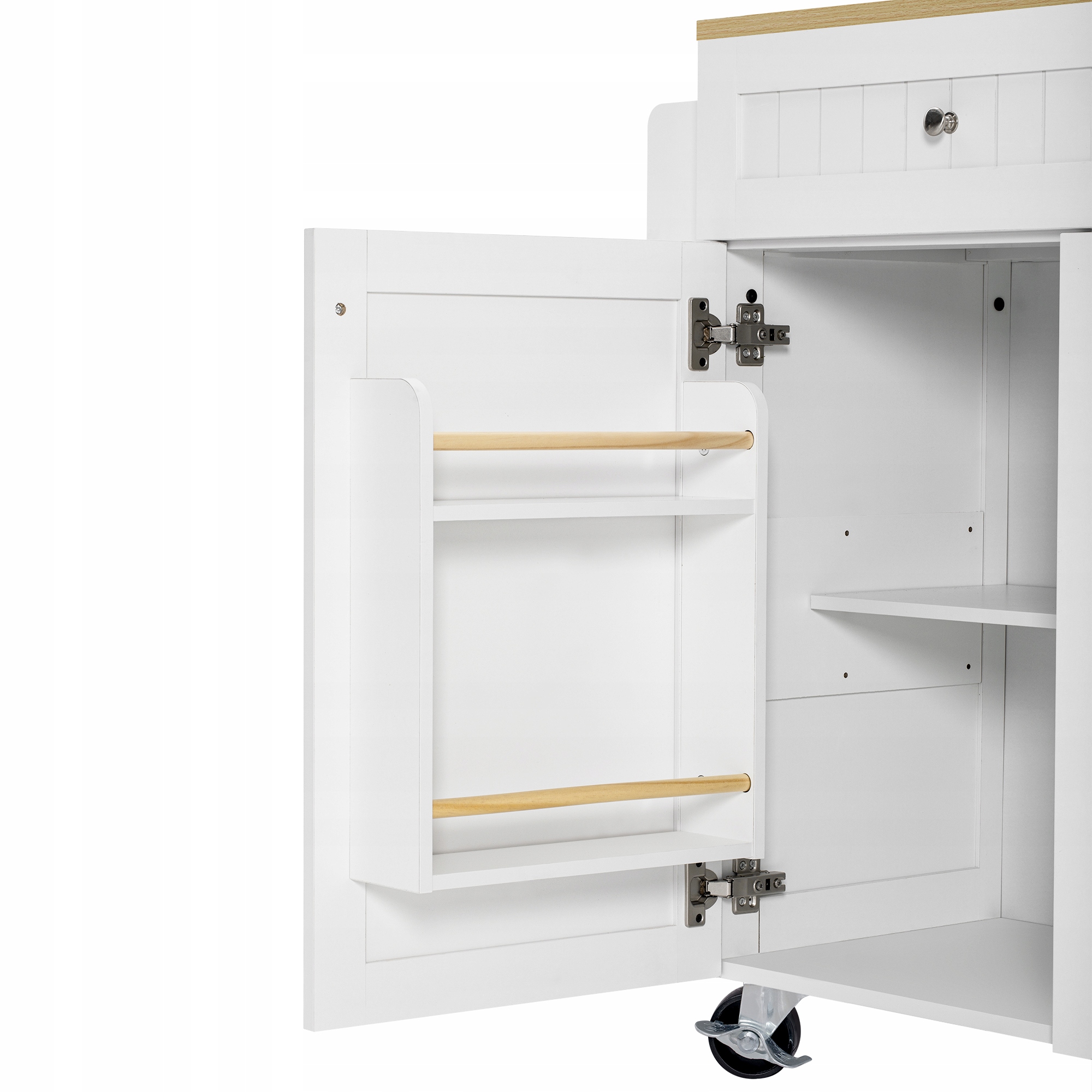 - Дворівневий, багатофункціональний ящик: Кухонний острів оснащений дворівневою системою ящиків. Верхня шухляда оснащена знімними відділеннями, які дозволяють гнучко розділити простір для зберігання посуду, пляшечок для спецій - кожен посуд має окреме відділення. Нижня шухляда оснащена вбудованим металевим стрижнем, ідеальним для зберігання великих каструль, кухонного начиння або кошиків.