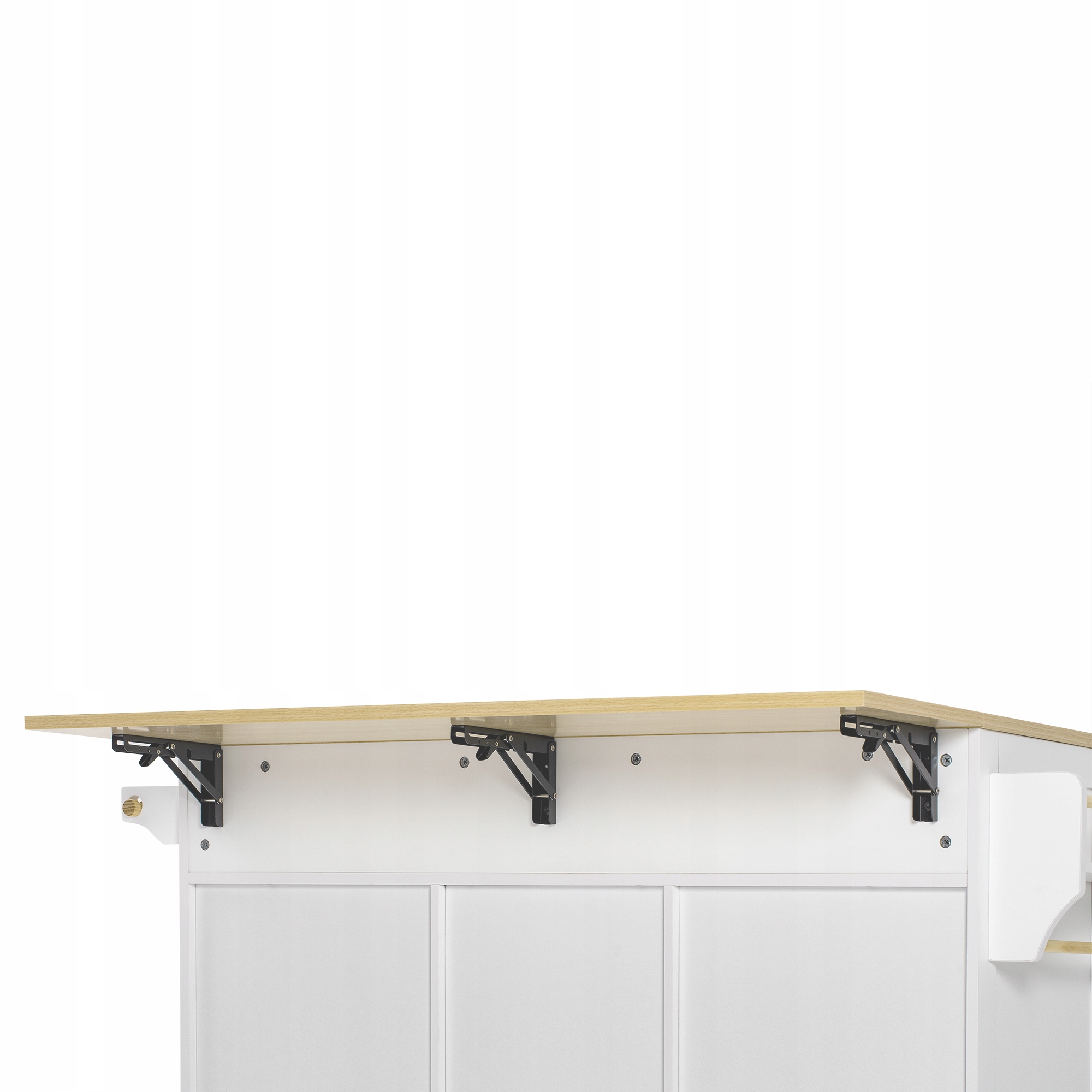 - Дизайн верхньої опори: унікальна конструкція опори кухонного острова дозволяє навіть нижчим жінкам із коротшими руками легко та самостійно відкривати та закривати складну стільницю. Три опорні ніжки забезпечують стійку поверхню столу. Дві бічні ніжки можна легко зафіксувати, щоб закріпити подовжувач столу. Середня ніжка забезпечує додаткову опору, ефективно запобігаючи провисанню стільниці посередині, збільшуючи таким чином її несучу здатність.