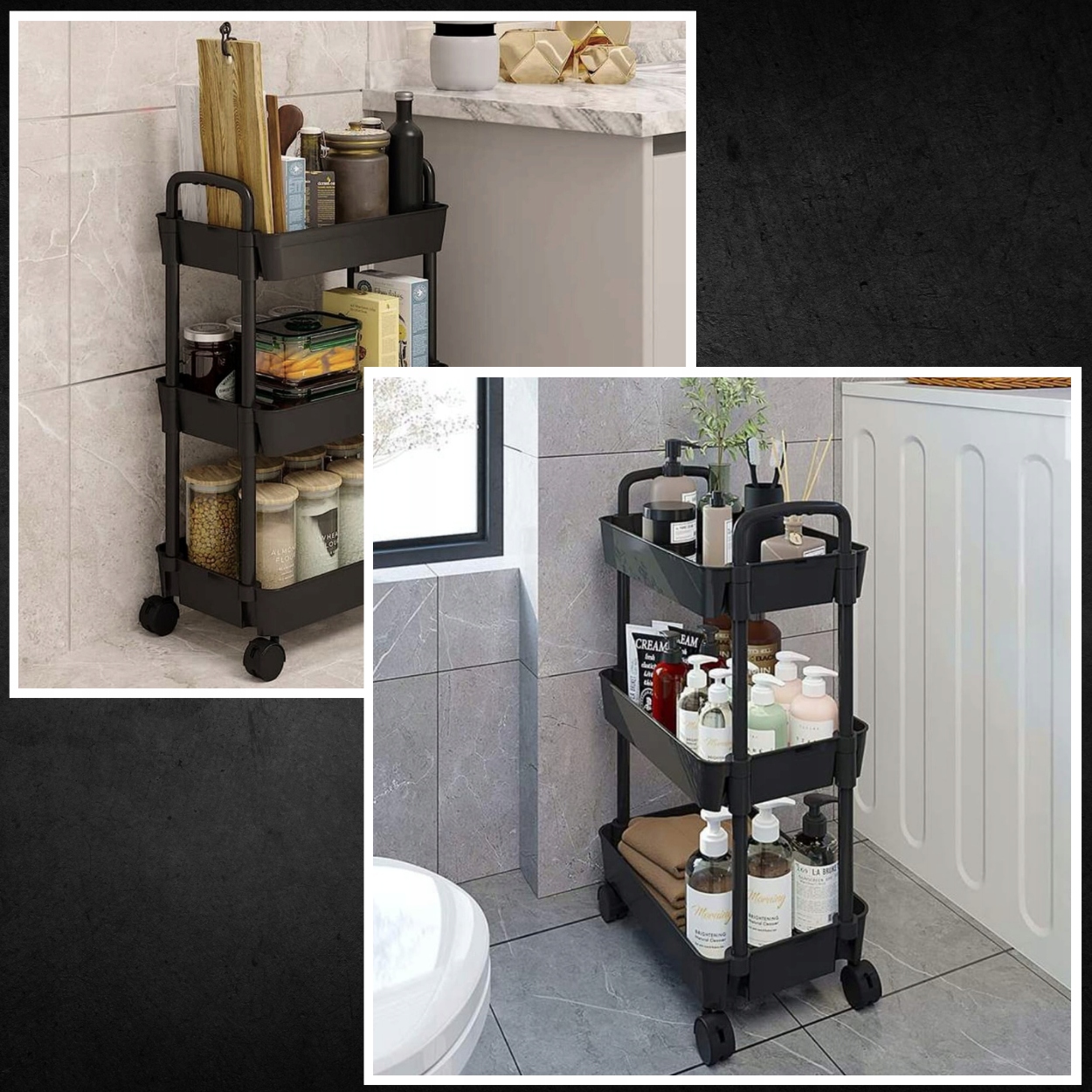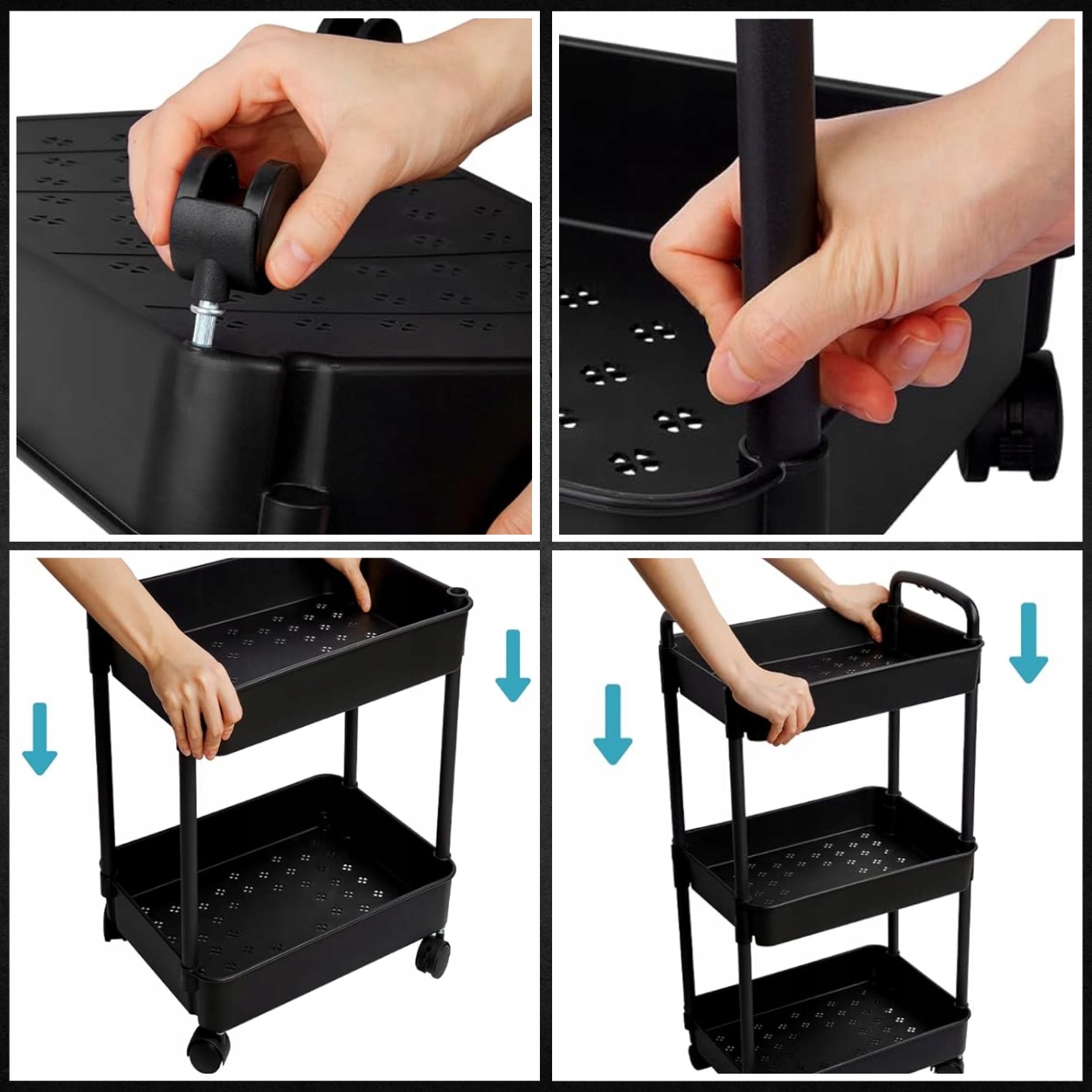 Універсальна полиця, ідеально підходить для різних приміщень, таких як кухня, ванна кімната, вітальня чи спальня, дозволяє використовувати вузький простір і полегшує доступ до необхідні предмети. Стелаж має три полиці, на яких можна розмістити багато різних аксесуарів, а також чотири коліщатка, два з яких фіксуються гальмом. У набір також входять п'ять гачків, які можна встановити зліва чи справа на будь-якому рівні.