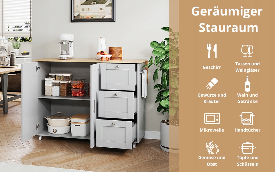 ✅ виправлення зберігання: двоповерхова шафа (з регульованими полицями) підходить для невеликих пристроїв, таких як мікрохвильова піч та кавоварка. 3 ящики праворуч оснащені тихими розсувними рейками для зберігання суден, спецій та інших предметів для задоволення різних вимог до зберігання. 4 Wyposażony W 5 Wysokiej jakości Kółek (2 Z Hamulcami), Które Wspierają elastyczny Ruch I Mocowanie, spełniają dwoje potrzeby w dowolnym miejscu i czasie. Okucia: Srebrne Metalowe Uchwyty Z okrągąą rurką i wieloregulowane Zawiay Zapewniają stabilne i płynnie działające drzwi; Ящики оснащені срібними володарями ручки, які полегшують відкриття та закриття, а загальний дизайн зосереджується на практичності та естетиці.