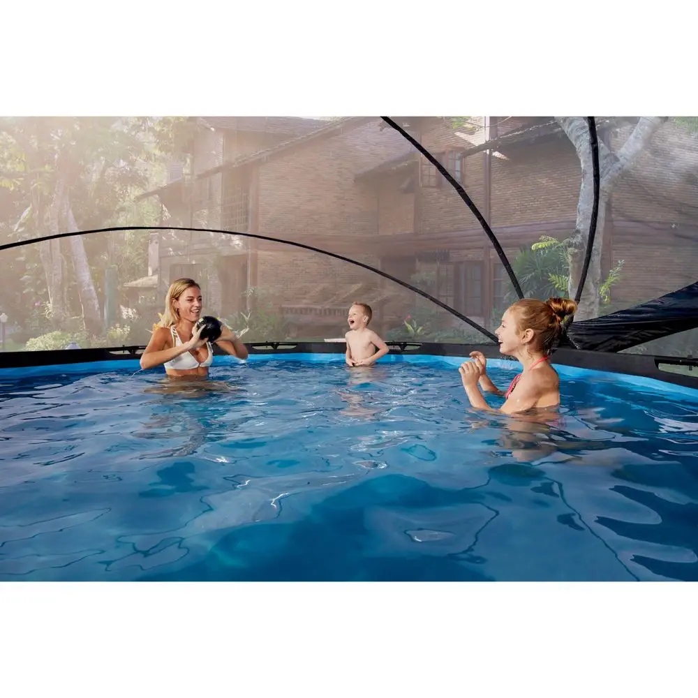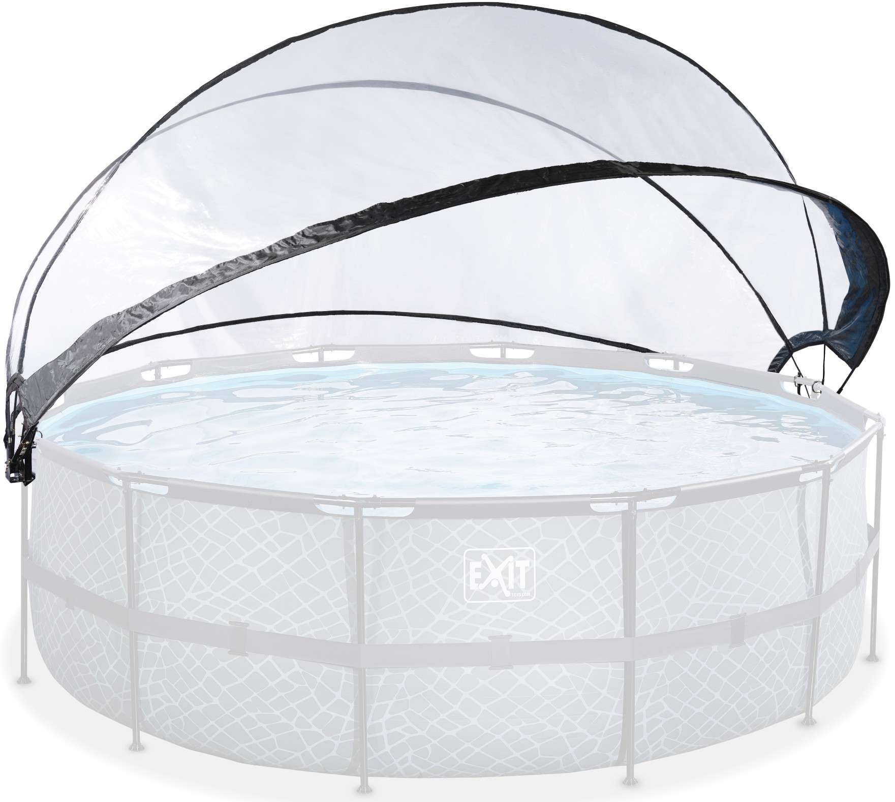 Накриття швидко кріпиться до рами басейну та легко відкривається та закривається завдяки унікальному шарнірному механізму. Ви миттєво плаватимете у власному критому басейні! У вас багато місця під накриттям, а завдяки прозорій фользі ви не пропустите нічого, що відбувається за межами басейну, накриття можна навіть залишити напіввідкритим, тому ви можете без проблем заходити в басейн і виходити з нього. З накриттям для басейну EXIT Toys ви зможете весело провести час у вітряну та погодну погоду!