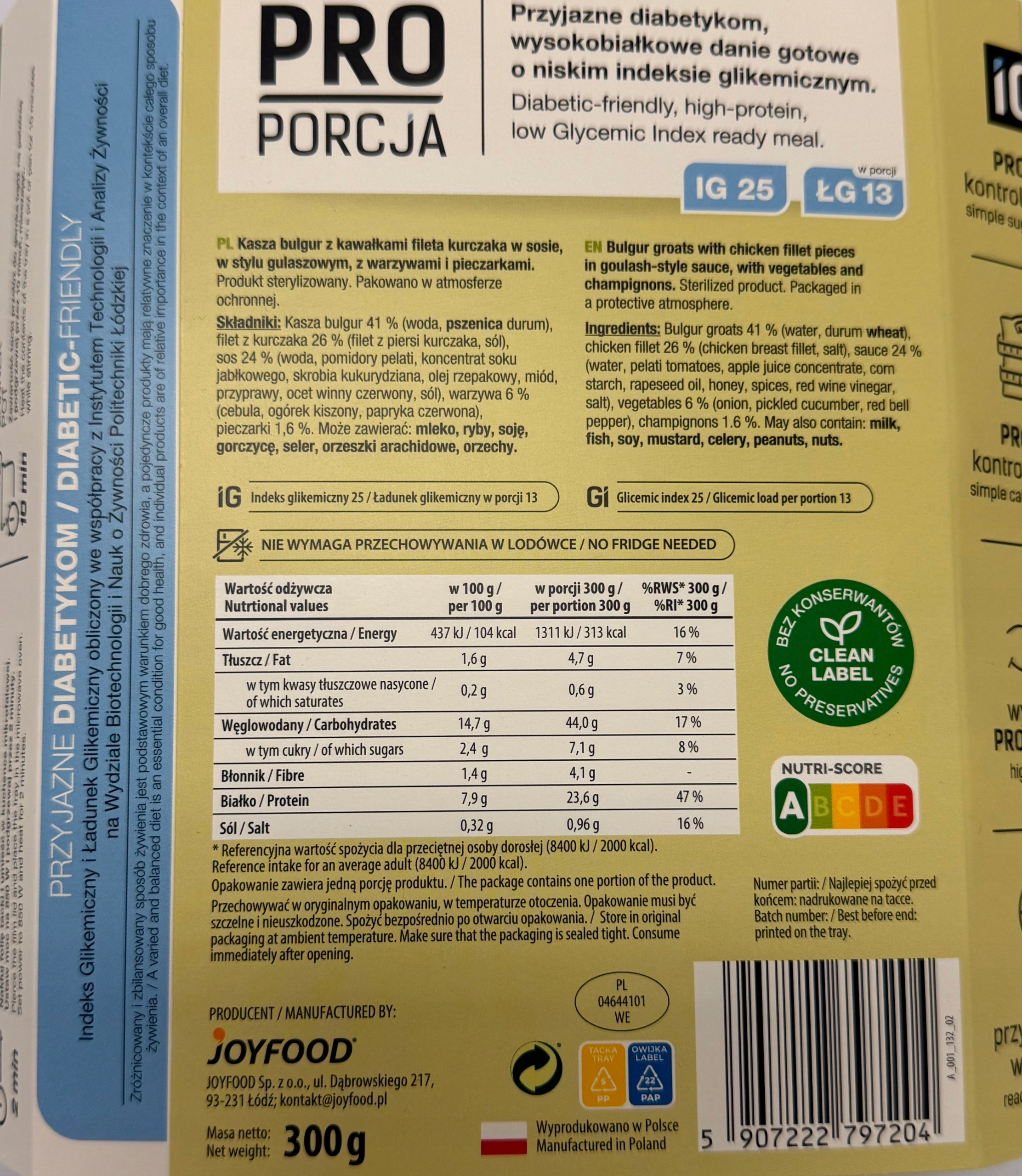 bulgur 41% (водяна пшениця), 26% курячого філе (куряча філе, сіль), помідори Пелламі, концентрат яблучного соку, крохмаль, кукурудзя олія, мед, спеції, сіль, червоний оцет. Овочі 6 % (цибуля, маринований огірок, червоний перець), гриби 1,6 %