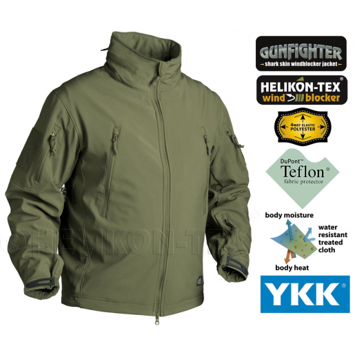 Helikon Gunfighter – це легка і дуже практична куртка з м’якої оболонки. Він виготовлений з 3-шарового еластичного матеріалу Shark Skin, який забезпечує чудову ізоляцію та захист від вітру та вологи, зберігаючи при цьому високий рівень повітропроникності. Зовні світшот покритий тефлоновим покриттям DuPont, яке захищає від бруду та води. Всередині підкладка з м'якого флісу. Куртка має сім кишень, прихований у комір капюшон і регульований капюшон, вентиляційні блискавки під пахвами, липучки на манжетах і шнурок. Капюшон зручно регулювати, не виймаючи рук з кишень, за допомогою шнурків, захованих у нагрудних кишенях.