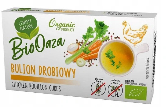 Інгредієнти: морська сіль, кукурудзяний крохмаль*, місо* (соя*, рис*, вода, сіль, коджі) , рослинні олії* (ши*, оливкова олія першого віджиму*), курячий жир*, куряче м’ясо* 5% (варена курка*, антиоксидант – екстракт розмарину*,) дріжджовий екстракт, сушені овочі* у змінних пропорціях 1,1% ( цибуля*, селера*, морква*, петрушка*, часник*), спеції*
