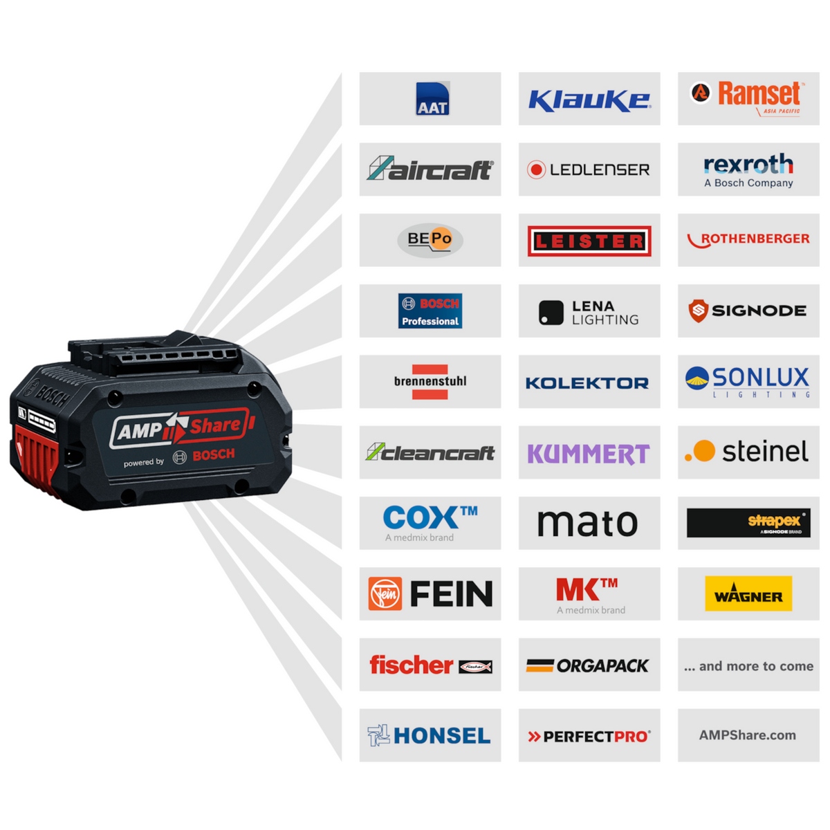 - Акумуляторна система AMPShare: усі акумуляторні електроінструменти FEIN оснащені системою AMPShare. Це означає, що акумулятори BOSCH Professional (серія 18 В) повністю сумісні з електроінструментами FEIN. Це означає, що користувачі, які вже мають акумулятори Bosch, можуть вільно використовувати їх в інструментах FEIN, що є великою перевагою з точки зору вартості та зручності. Це позбавляє від необхідності купувати окремі комплекти акумуляторів і зарядних пристроїв для кожної марки.