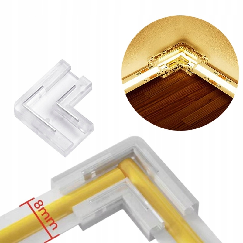 Кутовий з'єднувач для одноколірних стрічок за технологією COB (Chip on Board) з шириною ламінату 8 мм. Ідеальне рішення для з’єднання стрічки COB під прямим кутом без необхідності пайки! Просто вставте світлодіодну стрічку в призначене місце і все! Якщо світлодіодна стрічка ослабла після вставлення, просто притисніть металеві елементи до стрічки, щоб вони торкнулися паяльних майданчиків, після цього ми можемо бути впевнені, що стрічка не вислизне з роз’єму.