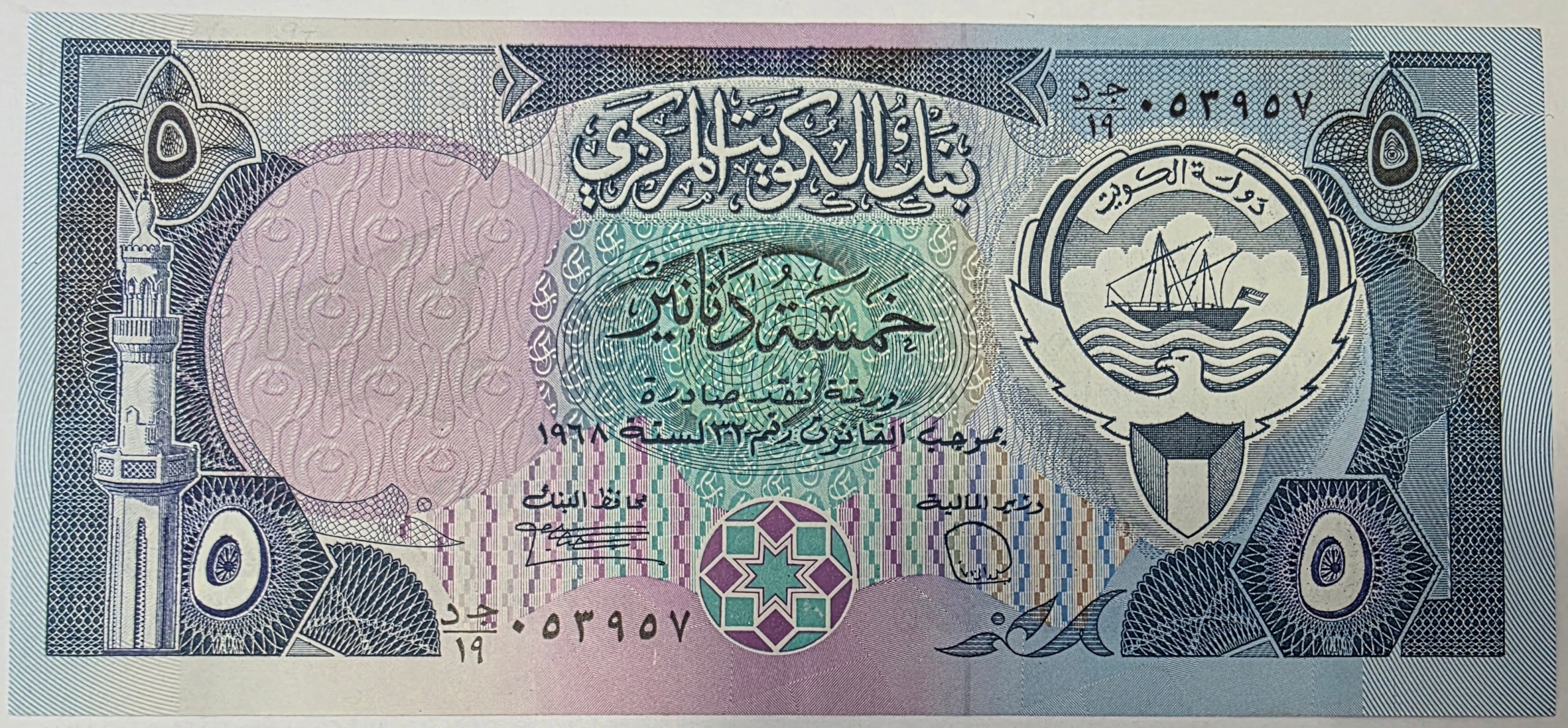 Оригінальна банкнота номіналом 5 кувейтських динарів, випущена Центральним банком Кувейту, є одним із найбільш затребуваних предметів класичних арабських випусків.
