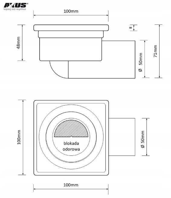 Трап Axus - горизонтальний злив fi 50, обертається на 360°, блокування запахів, решітка та матова нержавіюча рама 100x100 мм