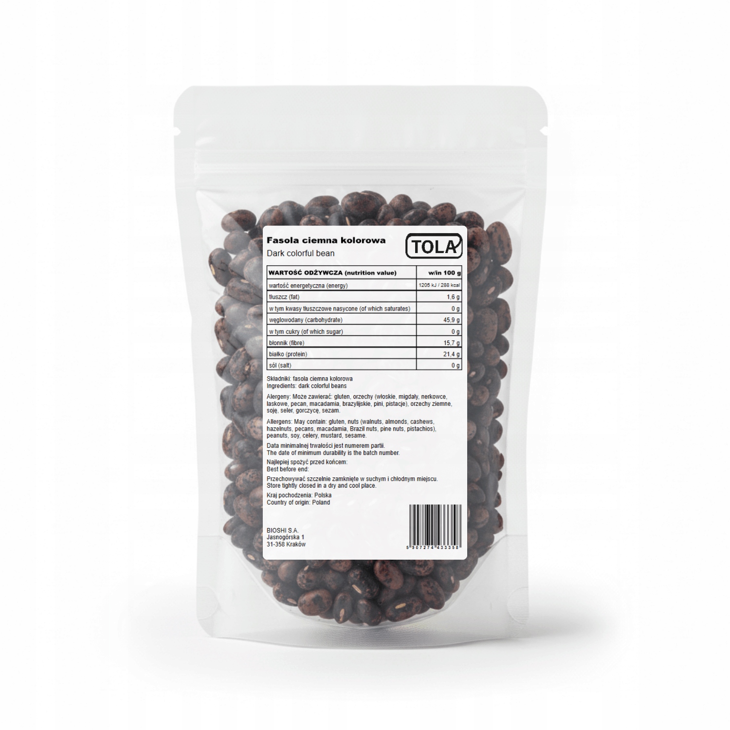 Відкрийте для себе унікальний смак і багатство природи з темною різнокольоровою квасолею від TOLA. Це не тільки красивий чорно-рожево-фіолетовий вигляд, але, перш за все, чудове джерело рослинного білка та клітковини. Кожне зернятко цієї квасолі – це маленький витвір мистецтва природи, який збагатить ваші щоденні страви поживною цінністю та незабутнім смаком. Ідеально підходить для людей, які цінують здорове, збалансоване харчування, і тих, хто хоче додати більше рослинних інгредієнтів на свою кухню.