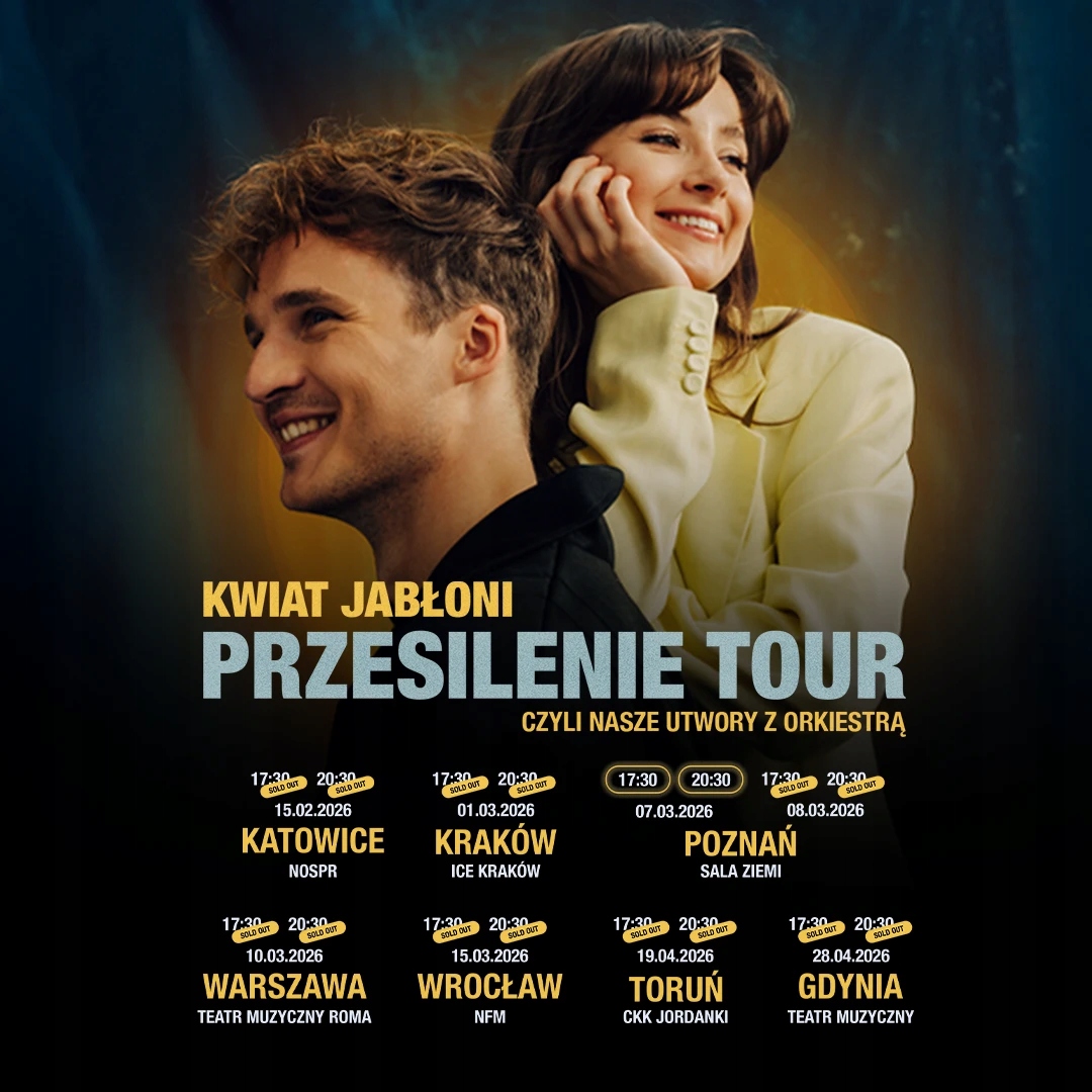 Додаткові дати оркестрового Przesilenie Tour: Познань (03.07.2026, 17:30 та 20:30) та Варшава (03.10.2026, 17:30 та 20:30)! Яблуневий цвіт сонцестояння відвідає найкрасивіші концертні зали та філармонії по всій Польщі - квитки вже у продажу! 15 хвилин вистачило, щоб записані живі виступи гурту та оркестру зібрали аншлаг. Зараз Kwiat Jabłoni анонсує свій прощальний тур Przesilenie, де вони зіграють свої пісні в оркестрових аранжуваннях перед оголошеною перервою. Наступної весни вони відвідають найкрасивіші концертні зали та філармонії у Варшаві, Катовіце, Кракові, Познані, Вроцлаві, Торуні та Ґдині! Зверніть увагу: квитки будуть згенеровані за 30 днів до події. FAQ - найпоширеніші запитання про квитки та концерти можна знайти ТУТ. Яблуневий цвіт сонцестояння маршрут «Ми ніколи раніше не робили нічого подібного і не було «Цвіту яблуні» в такій розширеній формі. Ми представимо наші пісні в оркестровій формулі, максимально для нашого гурту, і це буде ідеальний момент, щоб ми заснули разом з гуртом після нашого прекрасного оркестрового «Solstice»», — кажуть Кася та Яцек Сенкевич. На сцені буде 34 музиканти, які створять єдиний цілісний концертний організм. Окрім типових оркестрових інструментів, прозвучать також шарманка, ірландська флейта, мандоліна, банджо, маримба та гітара добро. Аранжування створили: Яцек Сенкевич, Антоні Войнар, Анджей Шаховський та Янек Стоклоса. Оркестром керує Матеуш Ґвіздала. «Оркестрові аранжування були нашою мрією з самого початку існування Kwiat Jabłoni. Таке враження, що ми не пам’ятаємо, який дивовижний, унікальний досвід — це слухати живий оркестр. Хотілося б нагадати про це ширшій аудиторії», — каже Кася Сенкевич. Назва Solstice відсилає до моменту спокою та спокою – це символічне закриття певного етапу та оголошення перерви в діяльності гурту. Маршрут «Цвіт яблуні – сонцестояння»: 15.02.2026 – Катовіце, NOSPR 03.01.2026 – Краків, ICE Kraków 07-08/03/2026 – Познань, Земний зал 03.10.2026 - Варшава, Музичний театр ROMA 15.03.2026 – Вроцлав, Національний музичний форум 19.04.2026 – Торунь, ЧКК Йорданкі 28/04/2026 – Гдиня, Музичний театр Регламент маршруту Вікові обмеження Зверніть увагу: особи, які не досягли 16-річного віку і бажають взяти участь у концерті, повинні перебувати під наглядом своїх батьків/законних опікунів протягом усього заходу. Також хочемо повідомити, що кожен квиток дозволяє лише одній особі потрапити на територію заходу, і квиток дитини не є дозволом на вхід для опікуна. Декларацію одного з батьків/законного представника можна завантажити ТУТ.