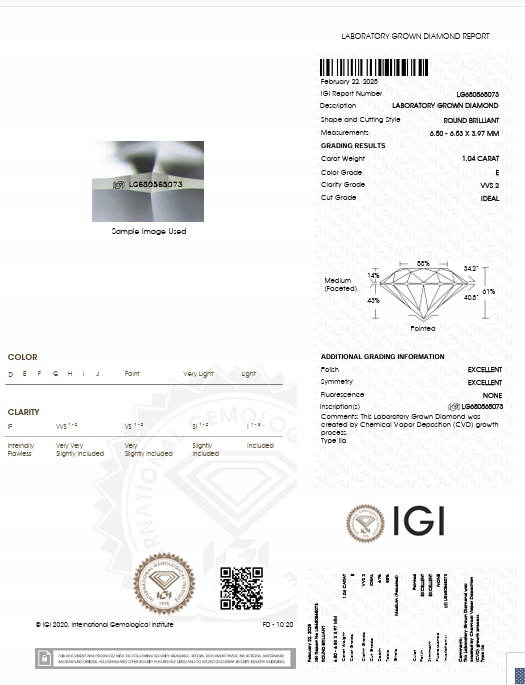 Лабораторний діамант 1,04 Ct | E | VVS2 - це камінь найвищої якості, який поєднує в собі ідеальний колір, майже ідеальну чистоту і елегантний розмір. Лабораторні алмази є інноваційною альтернативою природним алмазам, які пропонують винятковий блиск, нижчу вартість і менший вплив на навколишнє середовище. Це чудовий вибір для людей, які шукають розкішні ювелірні вироби, які є етичними та довговічними.