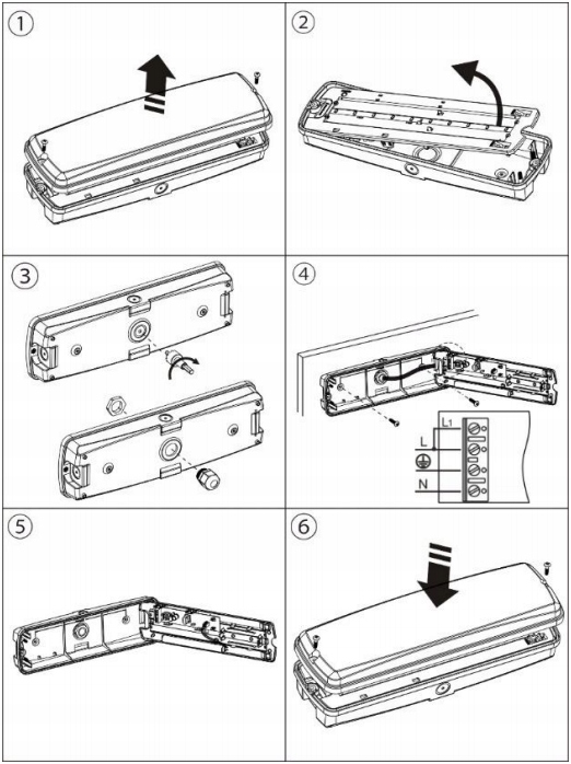 - Світильник придатний для монтажу на стелі або на стіні. Світильник поставляється з універсальними піктограмами, що позначають запасний вихід.