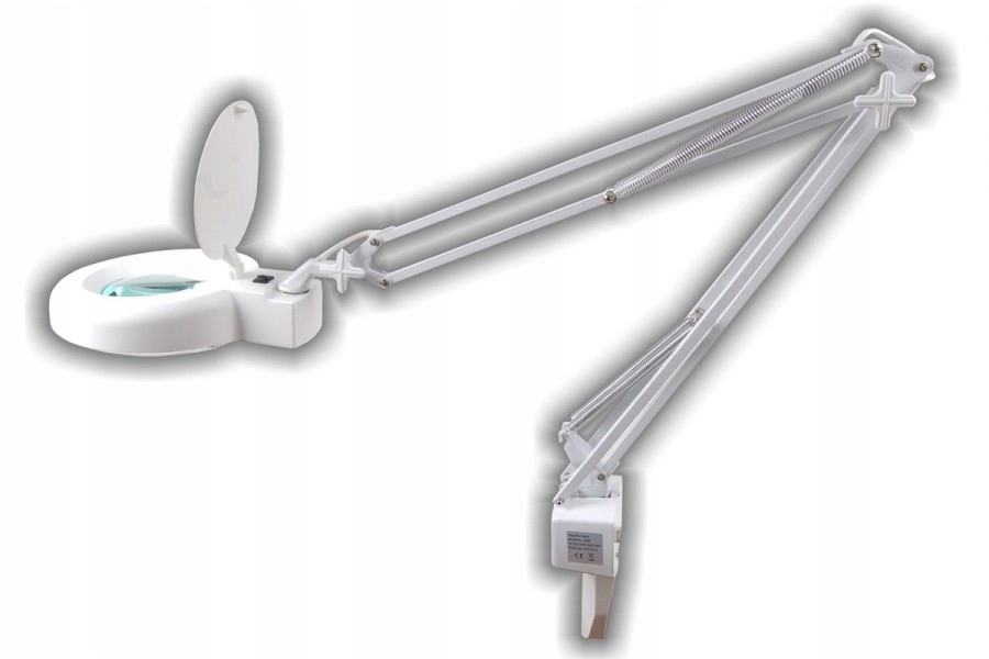 Спеціально посилена та правильно збалансована шарнірна рука має головку зі збільшувальною головкою скло 8 діоптрій, еластичне кріплення. Лампа призначена для встановлення на край столу.