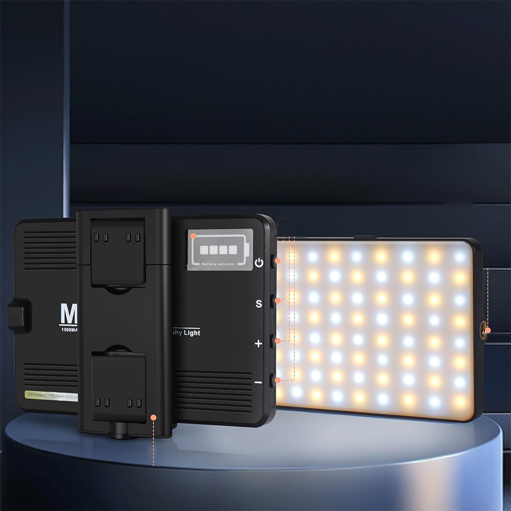 Ця портативна лампа камери має вбудовану літієву батарею 1500 мАг, а лампа мобільного телефону може використовуватися постійно протягом 3-8 годин. На звороті є індикатор акумулятора, тому ви можете в будь -який час перевірити рівень заряду акумулятора. Підтримує порт зарядки типу C і може використовуватися під час зарядки