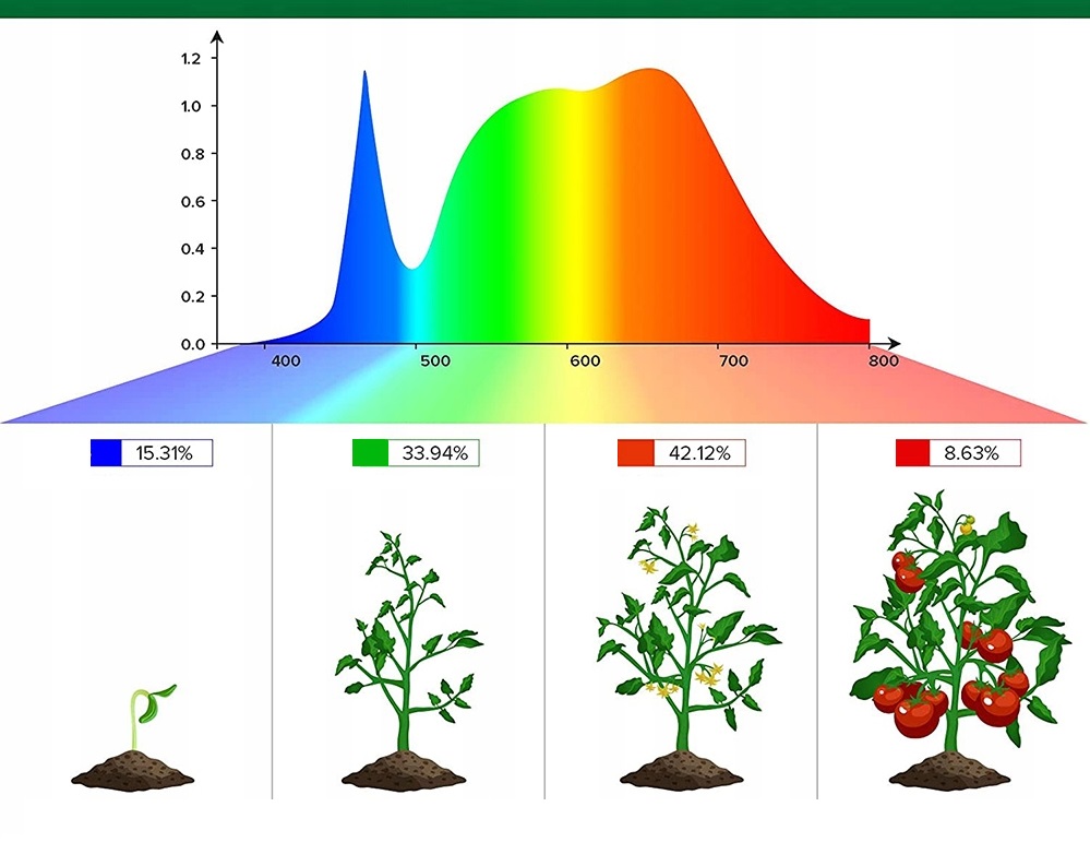 Незважаючи на відносно компактні розміри лампи, вона може освітлити значну частину врожаю. Пристрій є ефективним і випромінює повний спектр світла, який необхідний для правильного розвитку рослин, починаючи від проростання зерна до зростання, цвітіння та плодоношення.