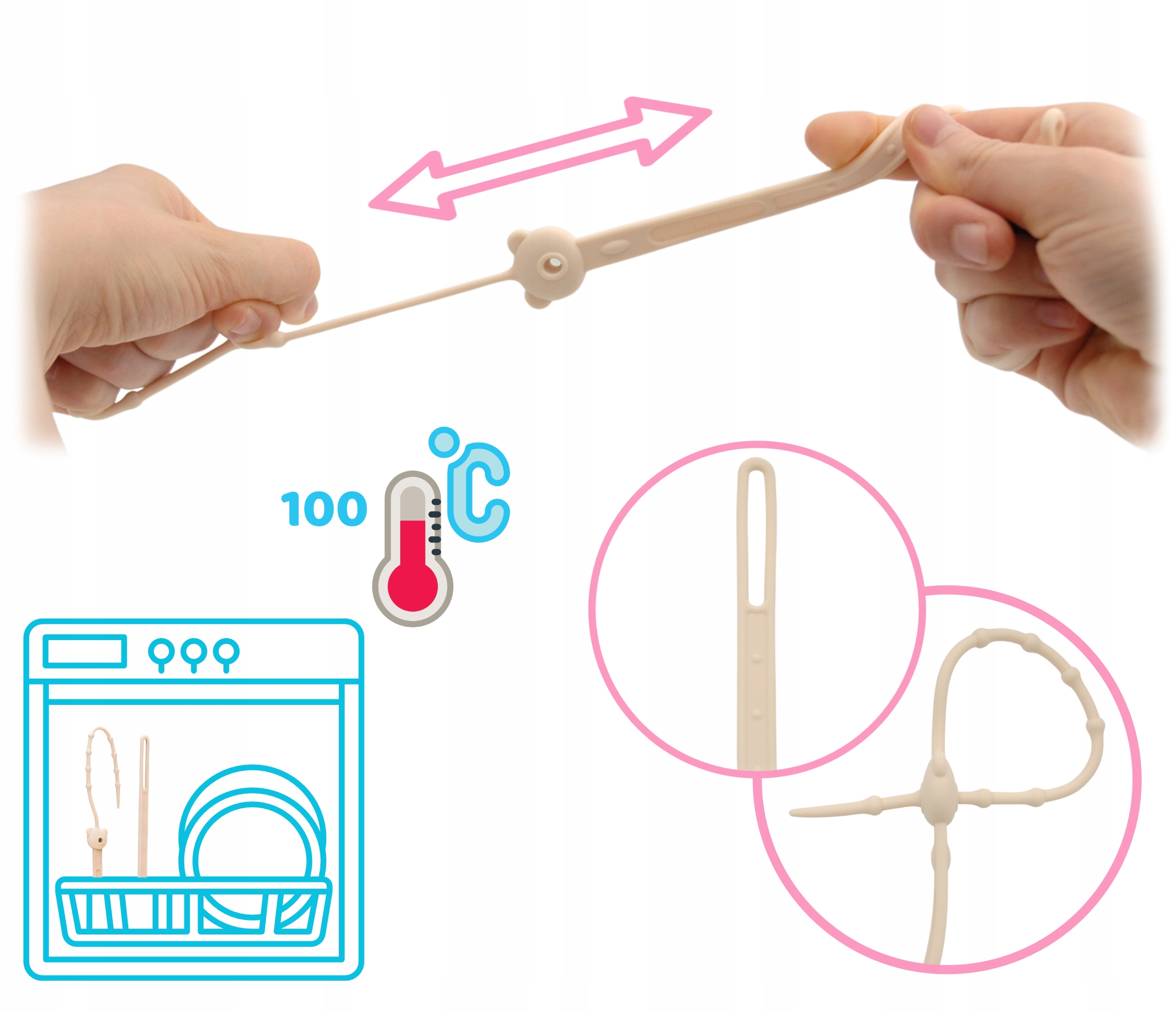 ✔ виготовлені в 100% силікону їжі - силікон- це дуже розтягнутий і міцний матеріал, завдяки якому ланцюг не ламається з сильнішим потягом. Посудомийна машина і дезінфекція в окропі.