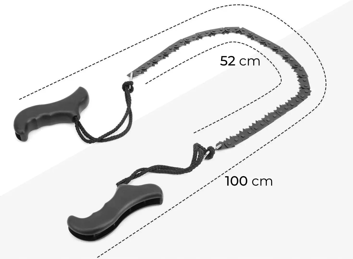 Наша кишенькова ланцюгова пила відповідає всім цим очікуванням! Її невеликий розмір, гостре лезо та тверда нержавіюча сталь товщиною 8 мм замінять традиційну пилу, що часто незручно приймати або взагалі не доступний. Гума та кістки. Навіть м'який метал!