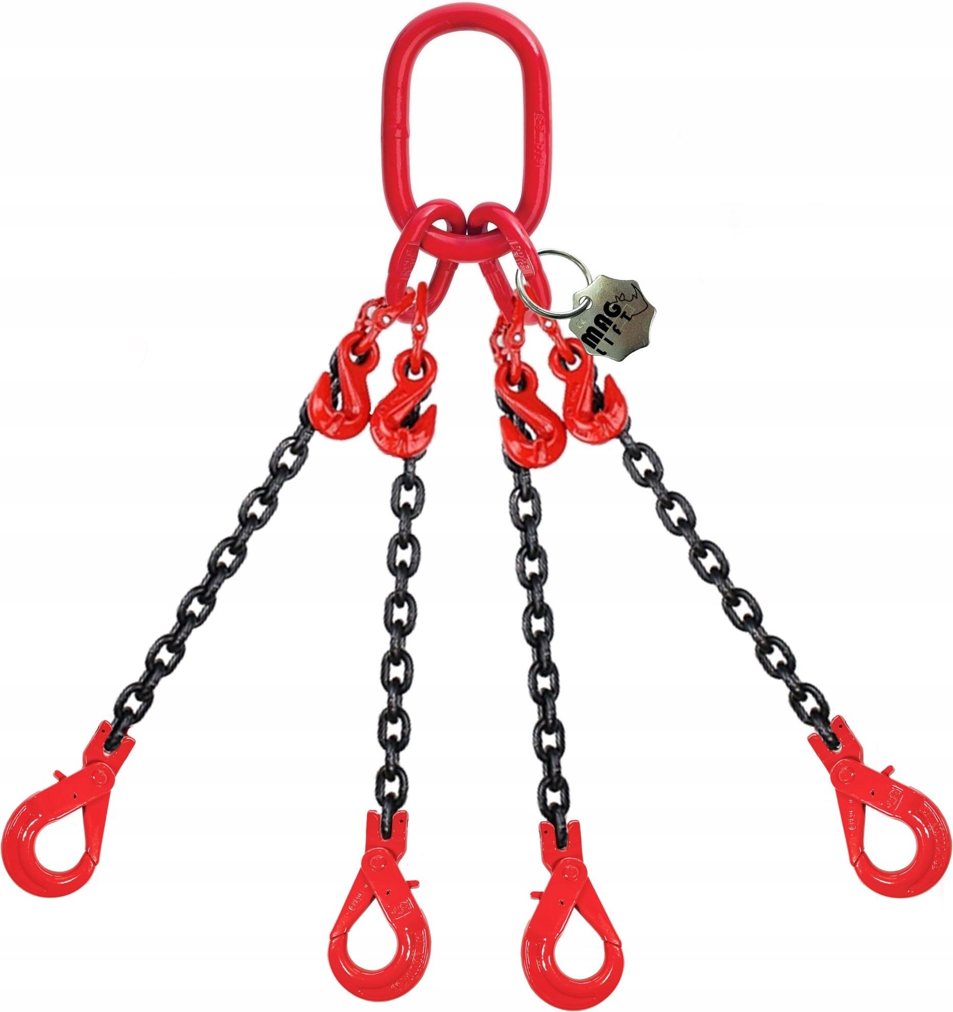 ВИКОНАННЯ: ланцюговий строп із 4 лапами, виготовлений відповідно до PN-EN 818-4 із сертифікованих компонентів та ланцюга строп із міцністю на розрив 800 Н/мм2 / GR8 / та відповідає вимогам Директиви про машини 2006/42 /WE ред. Травень 2006.