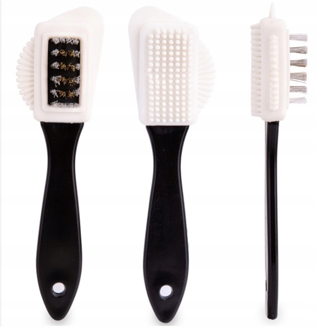 Кисть має гумову щетину, ідеальну для очищення нубука та видалення плям та нейлоново-мобільної щетини, яка обережно видаляє бруд із замусу. Бічні ребра ефективно видаляють постійний бруд з поверхні взуття, швів і країв, а вузька гумова щітка в кінці ідеально підходить для очищення жорстких канавок і порожнин.