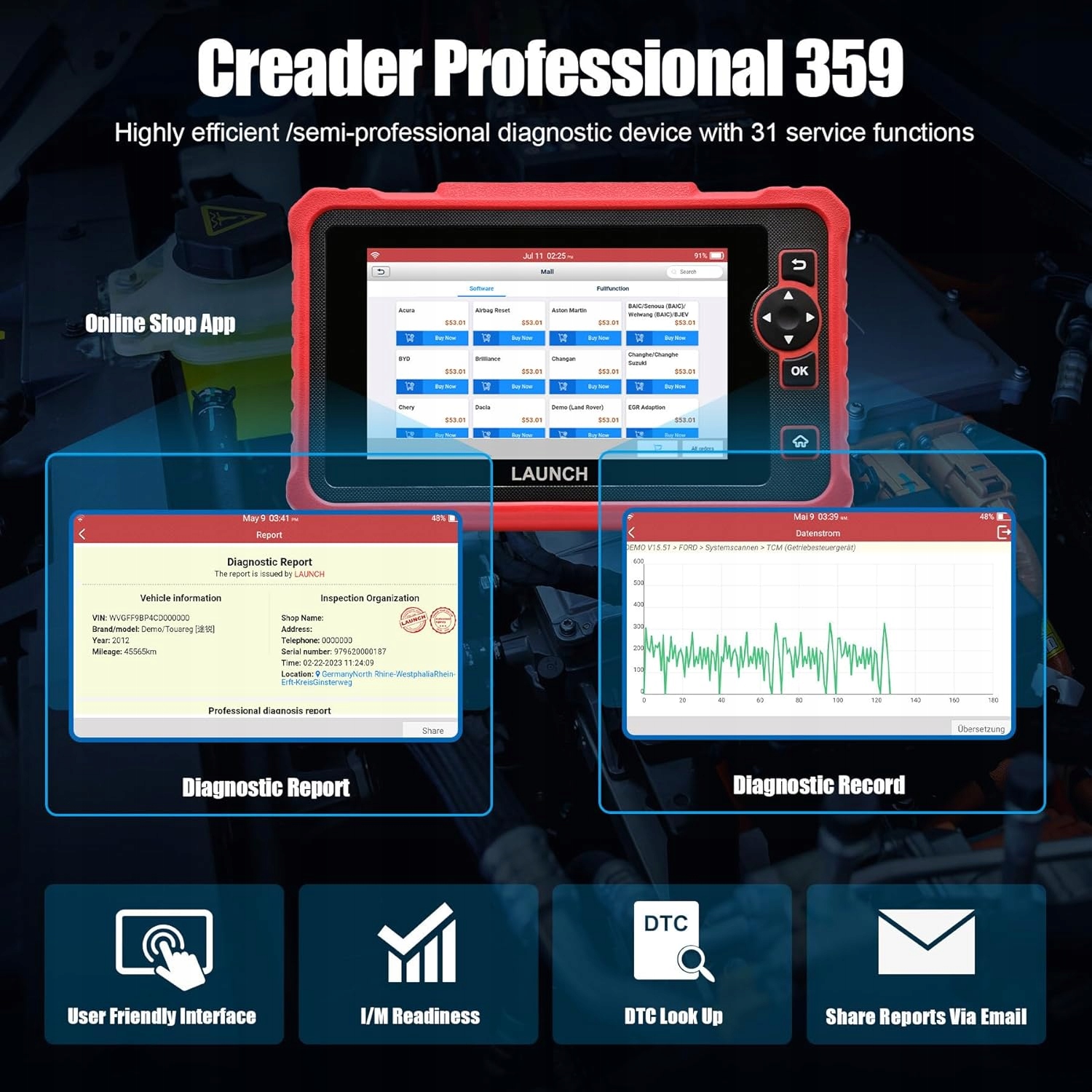 [Einfache Bedienung] Цей LAUNCH CRP 359 Diagnosegerät für Fahrzeuge basiert auf einem Android-System und fügt über einen 7-Zoll-Touchscreen. Mit 3 GB RAM und 32 GB ROM bietet es ausreichend Speicherplatz und Leistung. Der wieder aufladbare 6100 mAh-Akku sorgt für eine lange Standby-Zeit. Das Gerät unterstützt 11 verschiedene Sprachen, darunter Englisch, Spanisch, Französisch, Deutsch, Italienisch, Russian, Portugiesisch, Chinesisch, Koreanisch und Polnisch.". [Брайт Fahrzeugabdeckung + CANFD- und DOIP- Protokoll] Das LAUNCH CRP359 Diagnosegerä t для OBD2 іст mit über 100 Fahrzeugmarken. Es wurde das CANFD-Protokoll hinzugefügt, um eine Compatibilität mit GM-Fahrzeugen sicherzustellen, die ab dem Jahr 2020 hergestellt wurden. F-Chassis for BMW - Fahrzeuge und neueren Modellen für Land Rover und Jaguar compatibel ist schnellen Zugriff auf die Diagnose. Es ermöglicht die Analyse von 4 Live-Datenstömen auf einem Diagramm, wodurch verschiedene Daten gleichzeitig angezeigt werden können den kann." [31 сервісна функція] Діагностика LAUNCH CRP359 є першою вірою на ринку для діагностики OBD2. Es bietet eine Vielzahl der am häufigsten verwendeten Spezialfunktionen, die von Mechanikern für geplante Service- und Wartungsarbeiten benötigt werden. Ці функції підтримують інші Getriebe, SAS, EPB, TPMS, DPF, IMMO, BMS, ETS, Ölwechsel, Bremsen, AFS (адаптивна передня система), EGR (Abgasrückführung), SUNROOF (Schiebedach) і SUS-Reset (Federungseinstellung). Im Jahr 2023 wurde die neue CRP359 eingeführt. Мене цікавить Obd2-Diagnosegerät, мене цікавить Preis-Leistungs-Verhältnis bietet. Es ermöglicht Diagnosen auf OE-Ebene für all Systeme, einschließlich Fehlercodes, Datenströmen, Steuermodulinformationen und Betätigungstests für eine breite Palette von Systemen.Durch aktive Tests führt es spezifische Tests und Funktionen durch, indem es Faktoren ein - und ausschaltet, um mögliche Probleme mit Sensoren und Faktoren festzustellen."