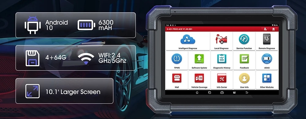 Тестер являє собою автономний прилад майстерні, діагностичний комбайн, оснащений сенсорним екраном 10'', броньований , корпус майстерні типу rugget Він оснащений дуже швидкою операційною системою Android 10.0 і дозволяє проводити бездротову діагностику через інтерфейс Bluetooth.